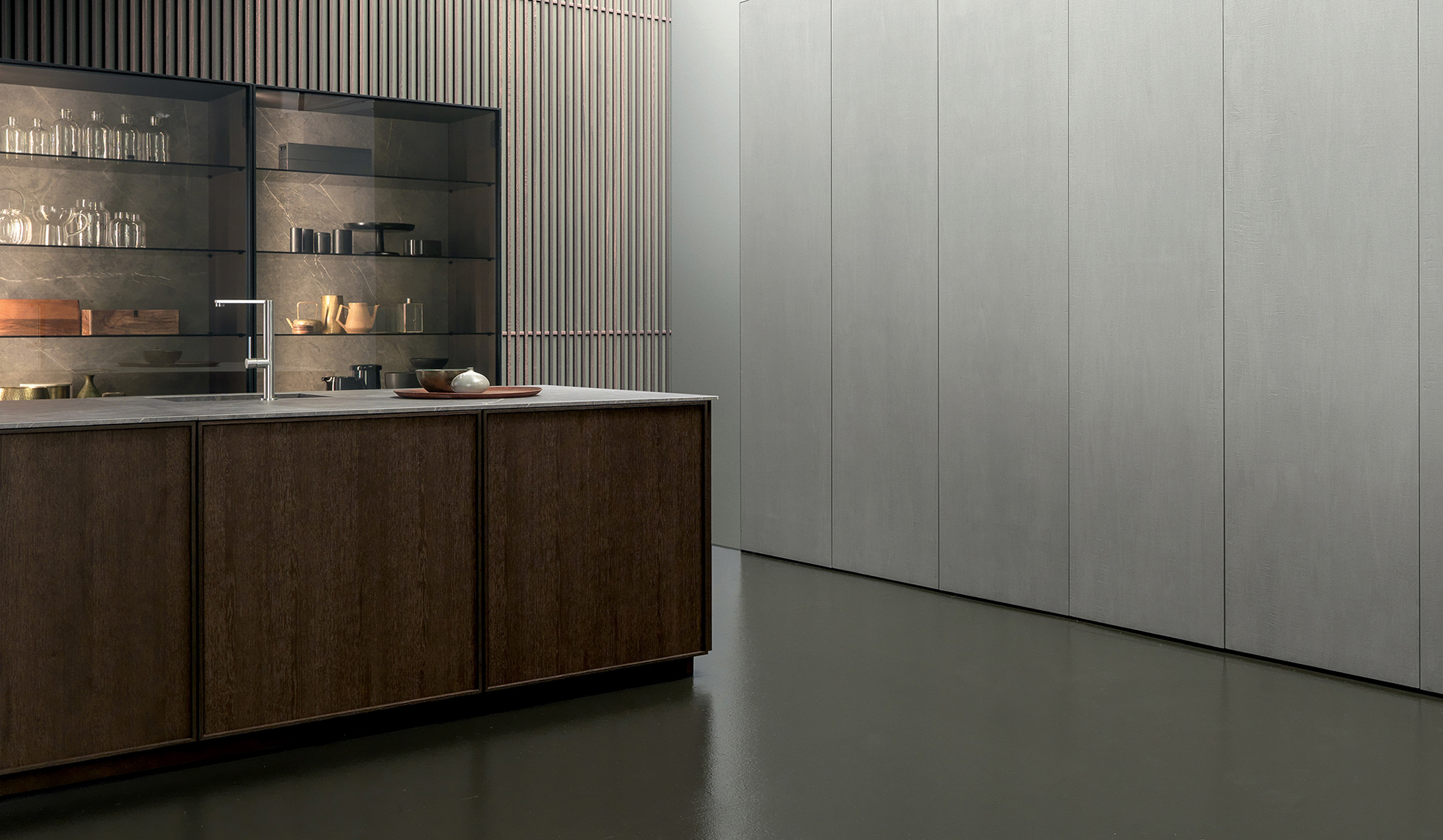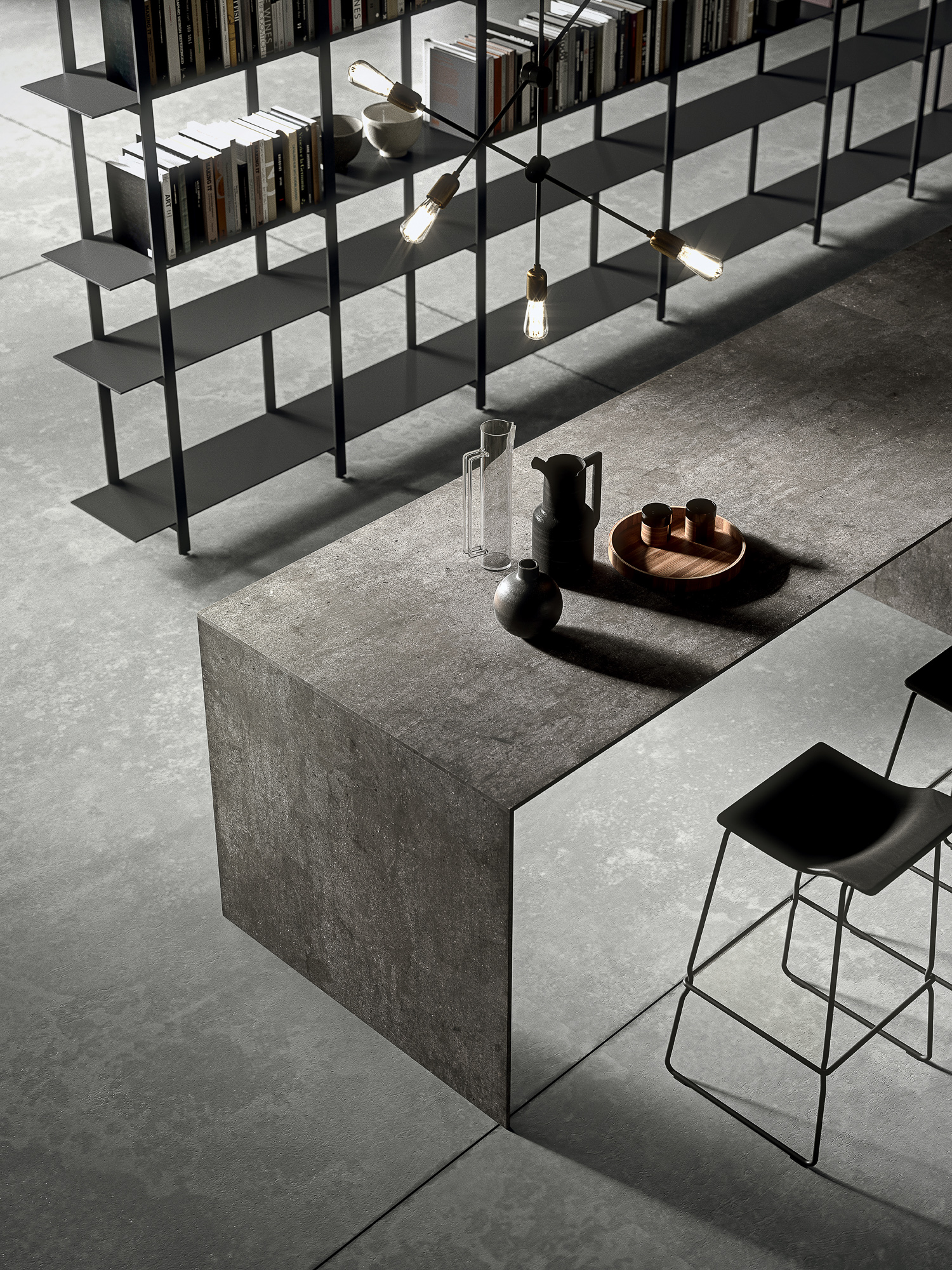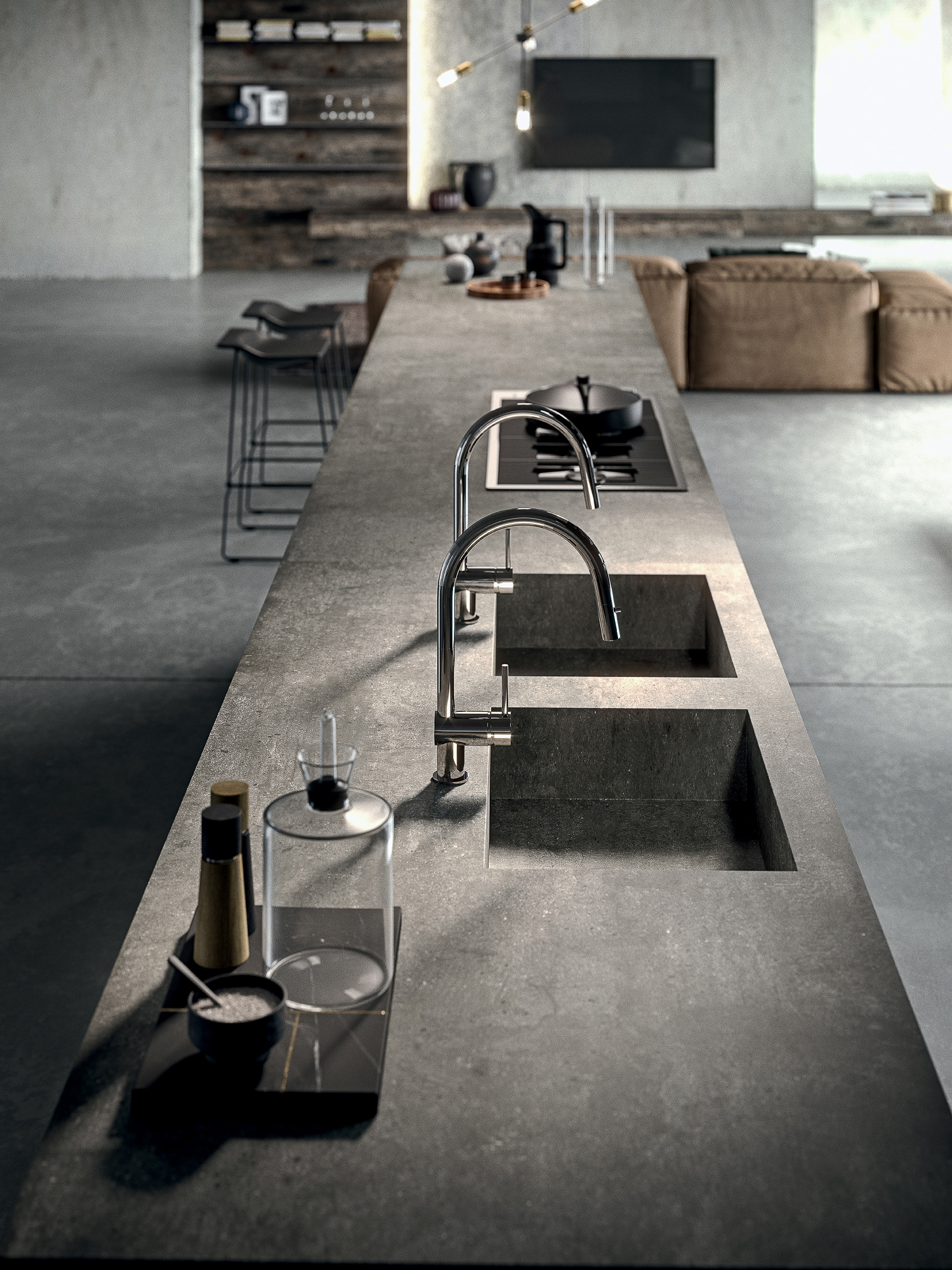 Il lungo top in gres city stone brown si allunga formando un tutt’uno con lo snack donando al progetto una linearità ed un minimalismo