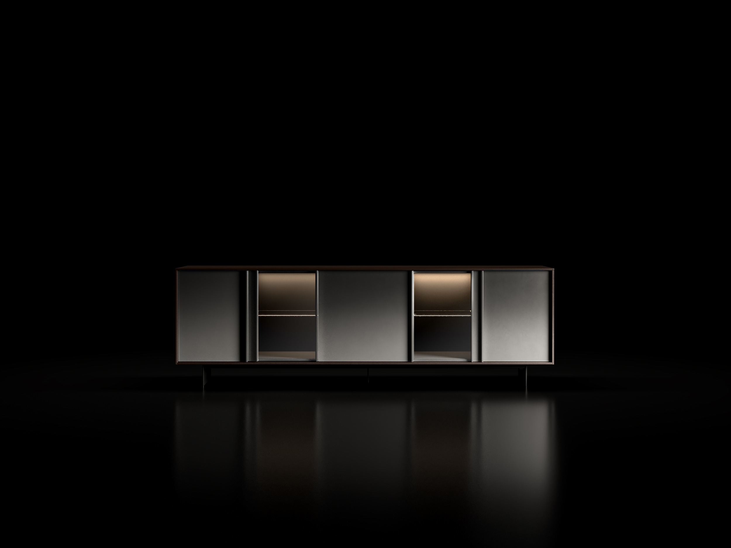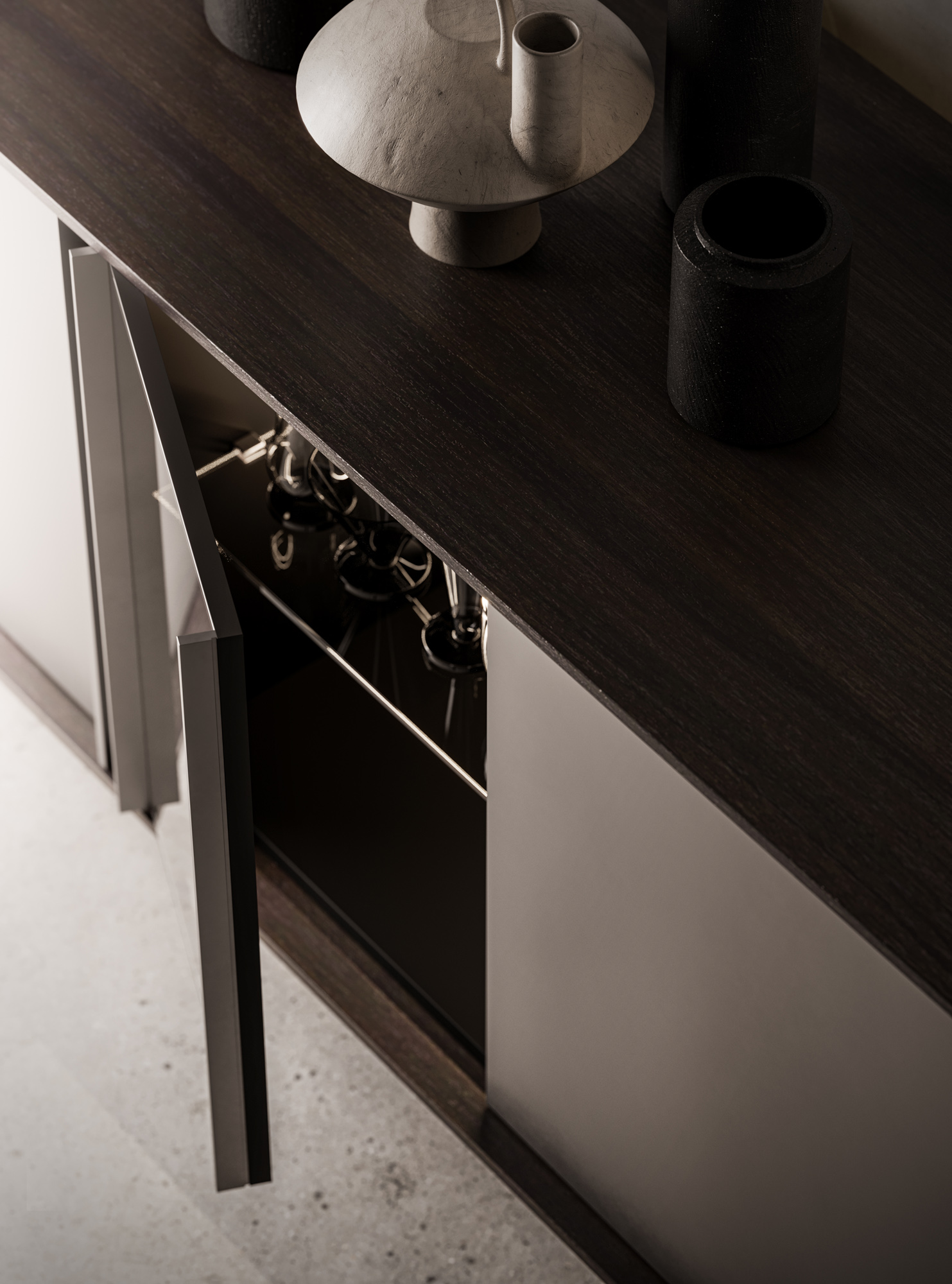 Il volume in metallo Dust ne definisce il rigore, mentre l’anta Glass apre la composizione a trasparenze e luce, amplificandone la profondità.