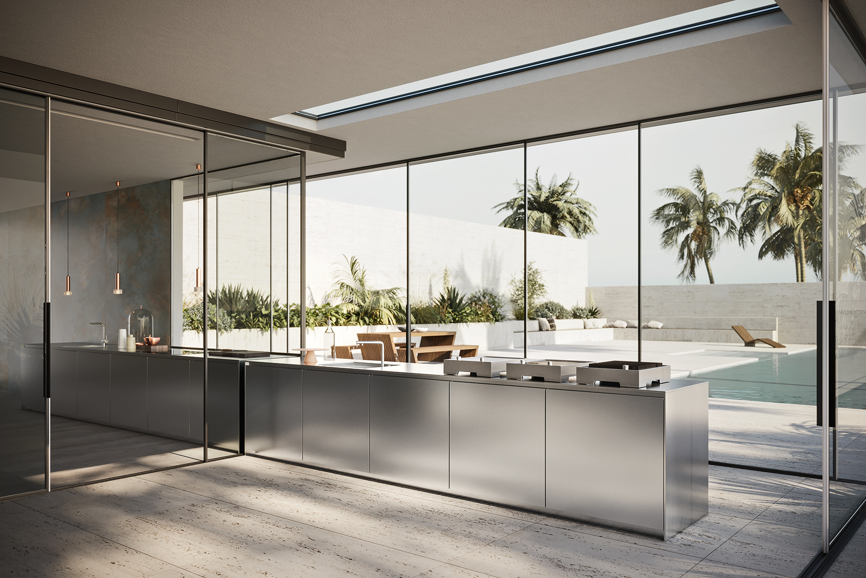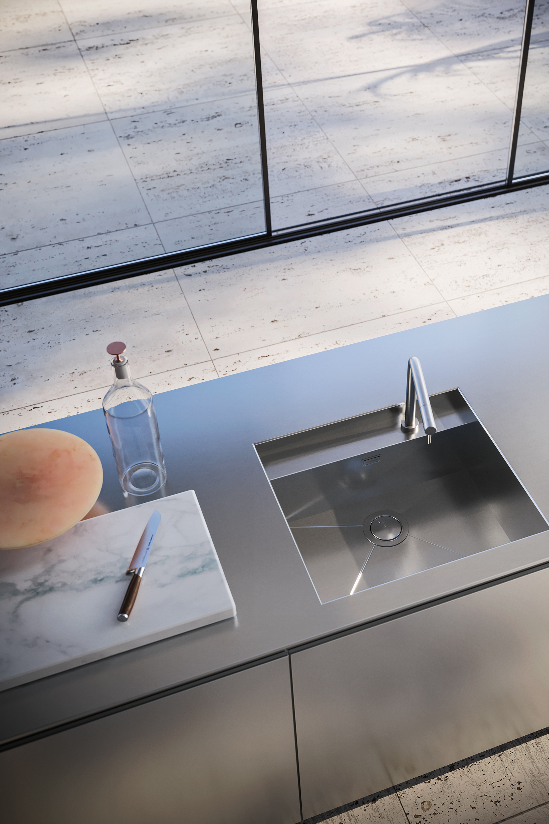 Basi, scocche, piano di lavoro e vasca integrata sono realizzati in acciaio inox, configurando un sistema continuo ad alte prestazioni. La versione standard prevede acciaio AISI 304; per contesti esposti a salsedine o agenti corrosivi è disponibile la configurazione in AISI 316, indicata per installazioni in prossimità di ambienti marini.