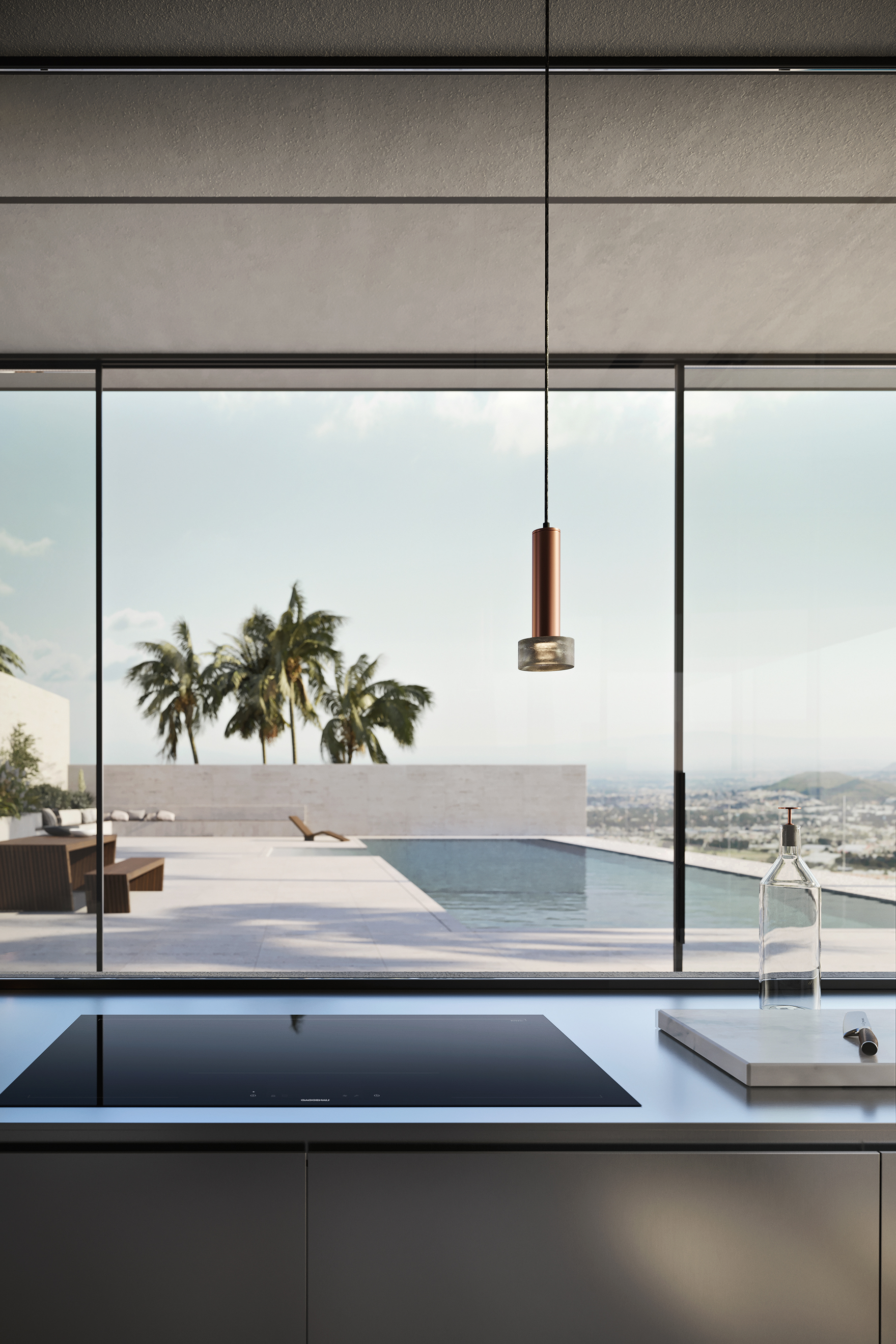 I piani cottura Mate si inseriscono in appoggio sul top in acciaio, mantenendo la superficie libera quando non in uso. Induzione, teppanyaki e barbecue completano l’organizzazione funzionale dello spazio.