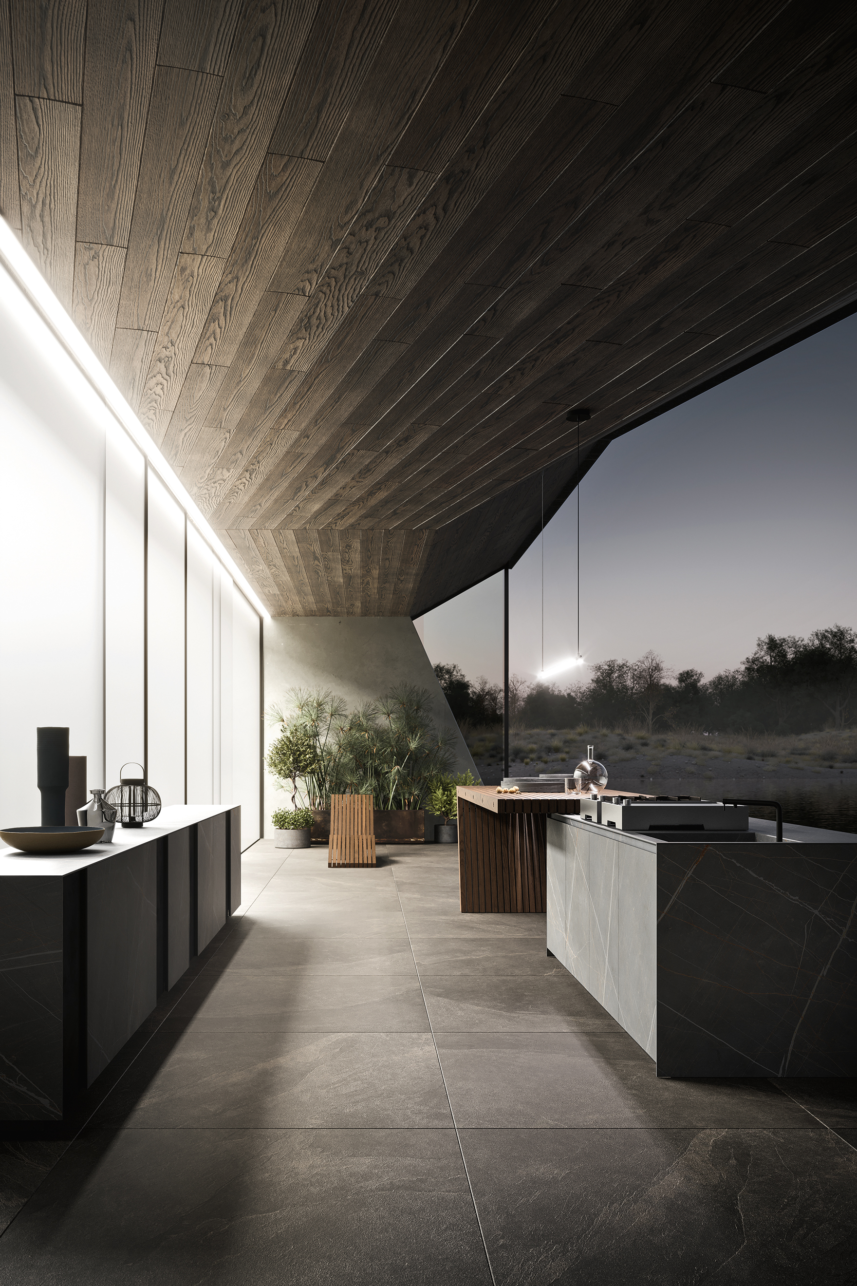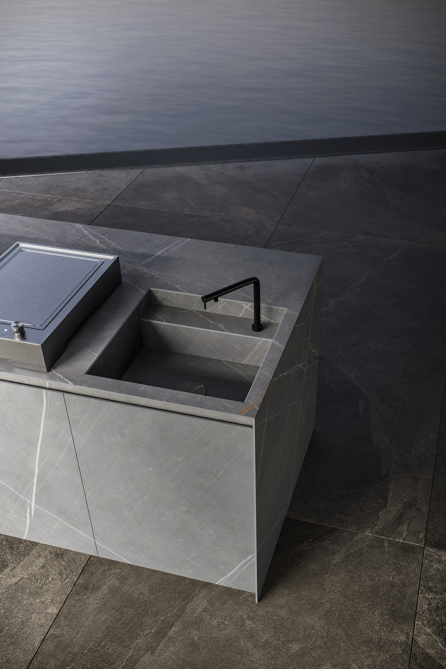 La penisola e la chaise longue XY in frassino massello versione Light introducono una componente lignea che bilancia la profondità del gres e della pietra. Il legno dialoga con la materia scura, definendo una relazione calibrata tra superficie minerale e presenza naturale.