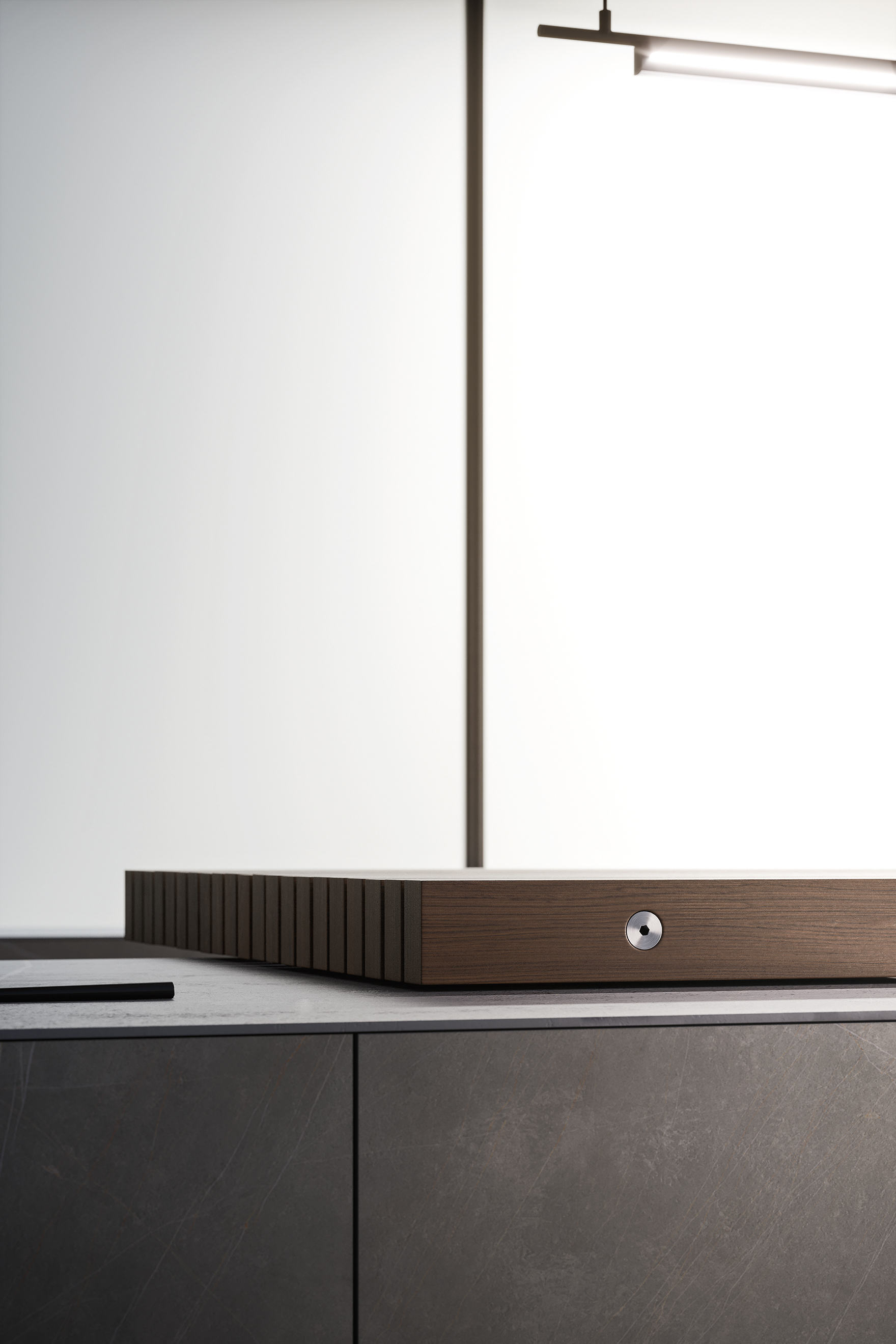 La superficie scura, attraversata da venature profonde, costruisce un volume rigoroso che dialoga con la luce naturale e con l’ambiente circostante.