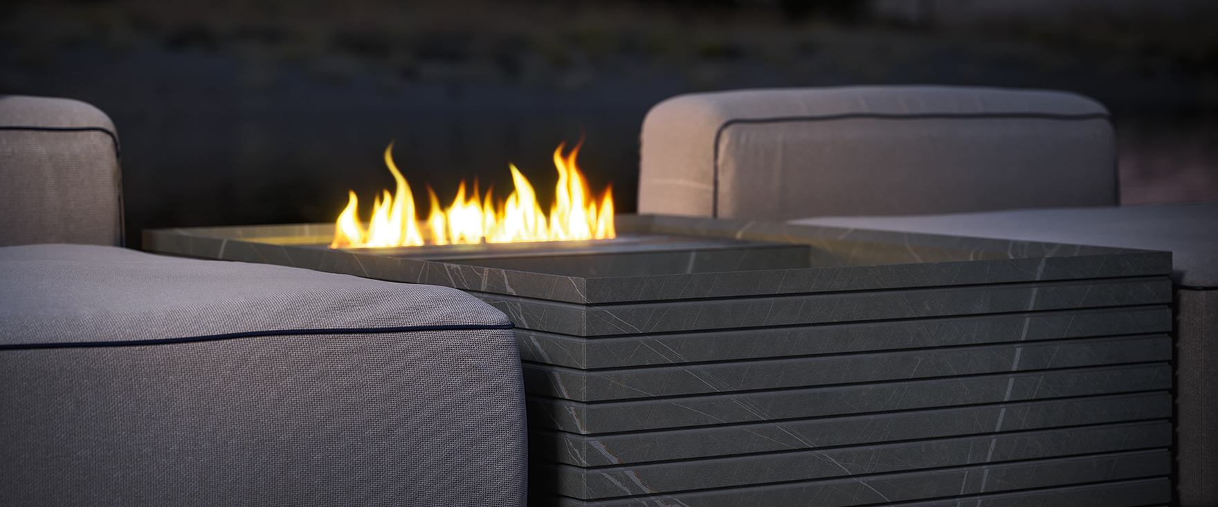 Il sistema Block introduce un elemento a terra in pietra Sahara Noir Raw con lavorazione Millerighe. Il vano dedicato al camino a bioetanolo inserisce il fuoco nella composizione, trasformando l’outdoor in uno spazio conviviale anche nelle ore serali.