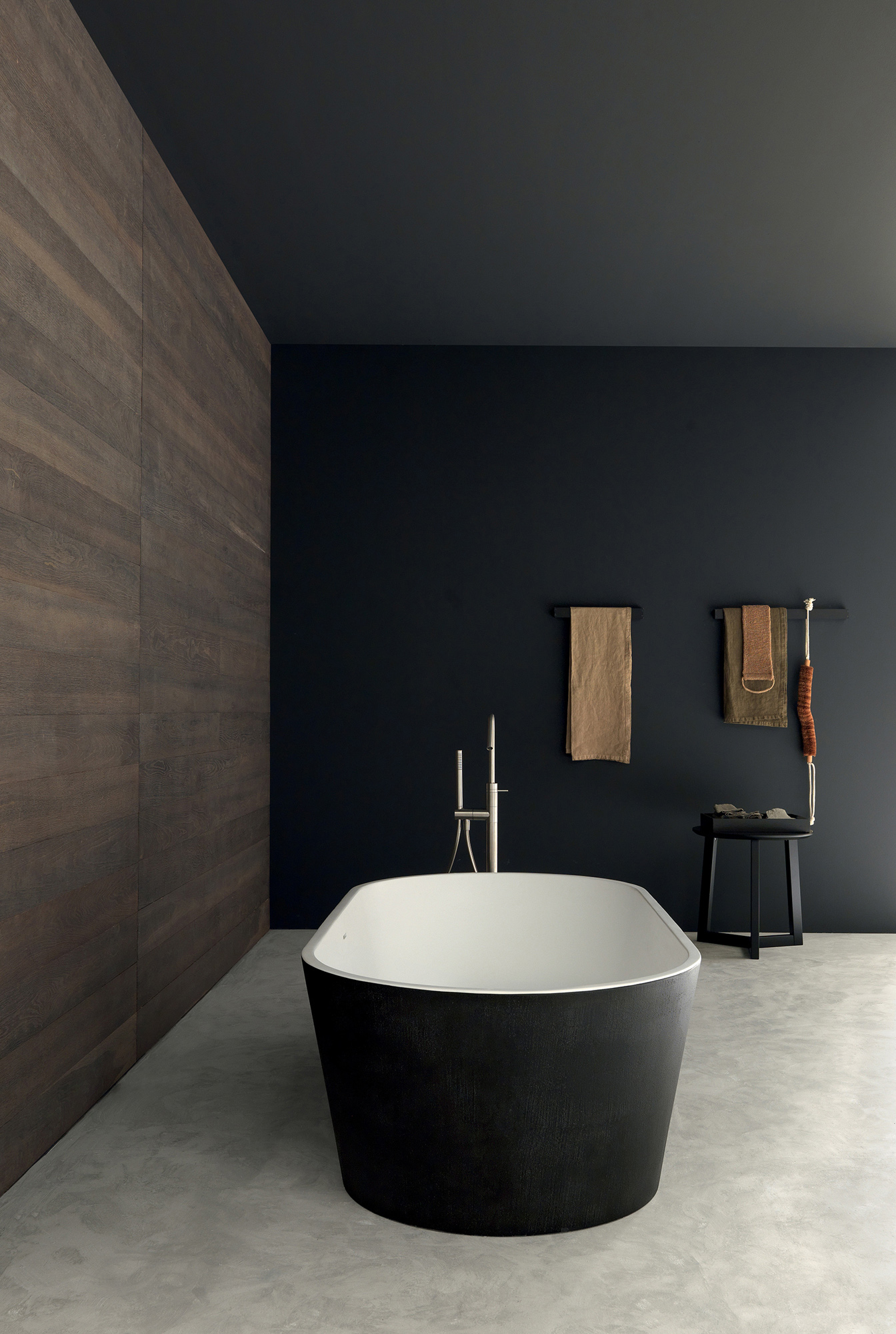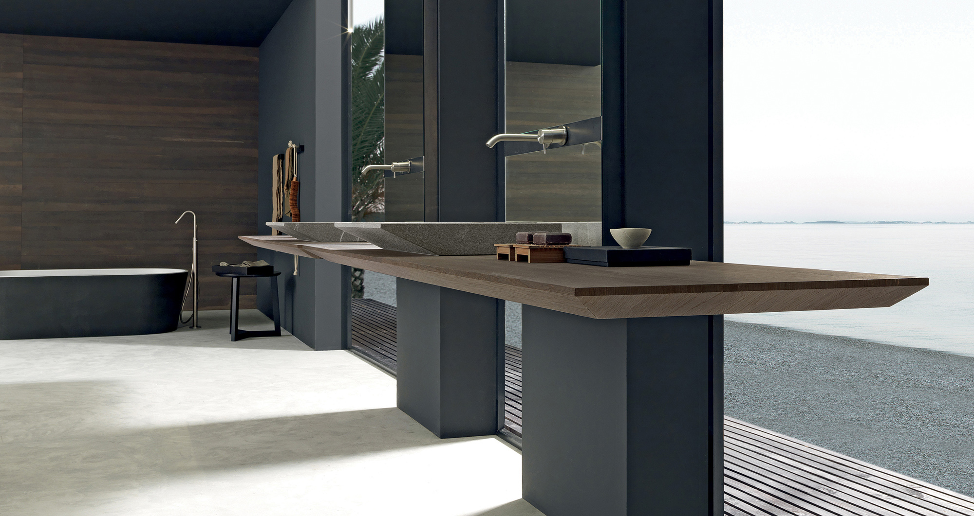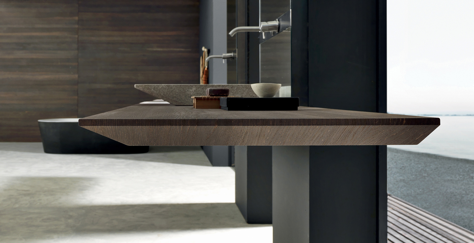 Nuove proporzioni prendono forma attraverso una combinazione armoniosa di materiali diversi, dando vita a un arredo bagno moderno dal forte impatto visivo. Il telaio verticale a specchio sostiene un piano sospeso in ferro nero e rovere carbone, creando un equilibrio perfetto tra leggerezza strutturale ed estetica contemporanea.