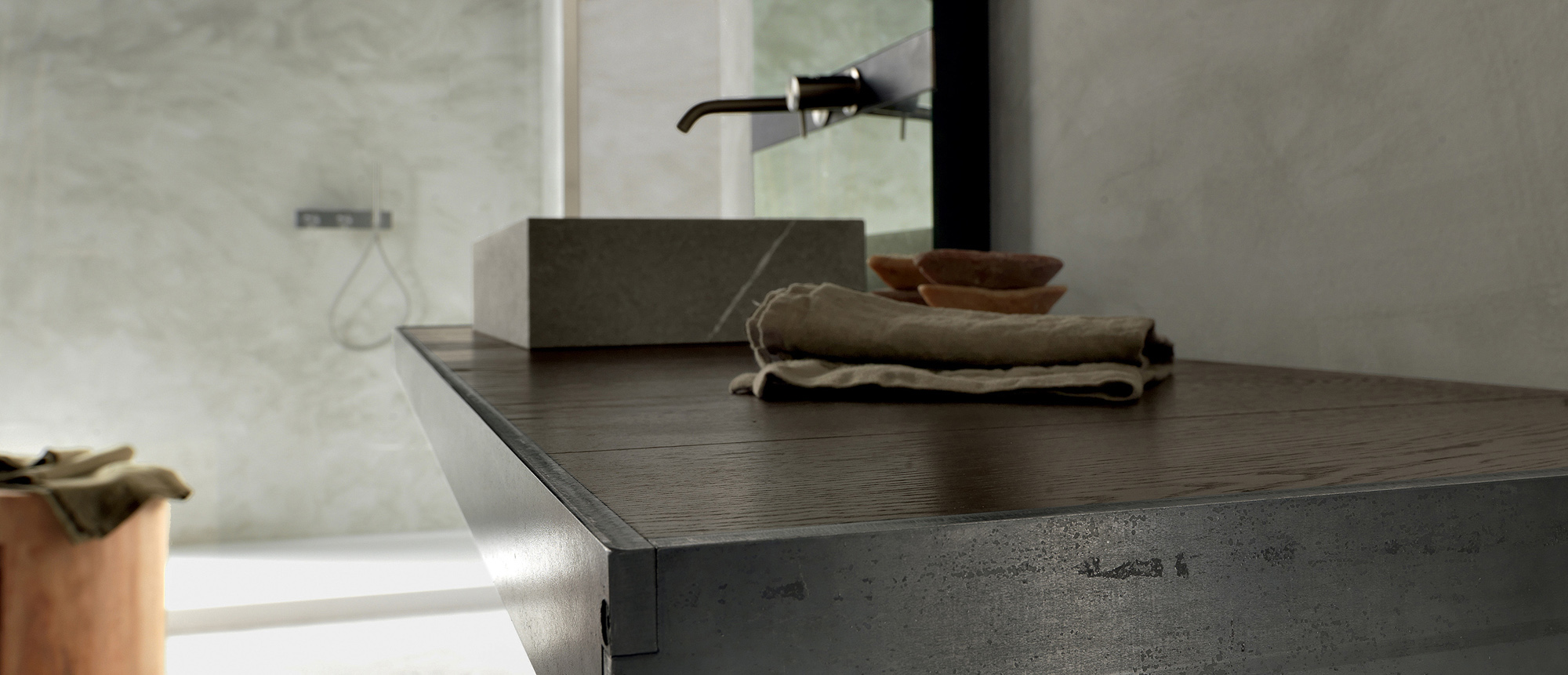 Il piano da 52 mm in rovere ossidato, realizzato con tecnica folding, rappresenta il cuore del progetto. La qualità dei materiali naturali e la cura nelle lavorazioni garantiscono resistenza, durata e un impatto visivo di grande valore, perfetto per chi cerca soluzioni di arredo bagno di alta gamma.