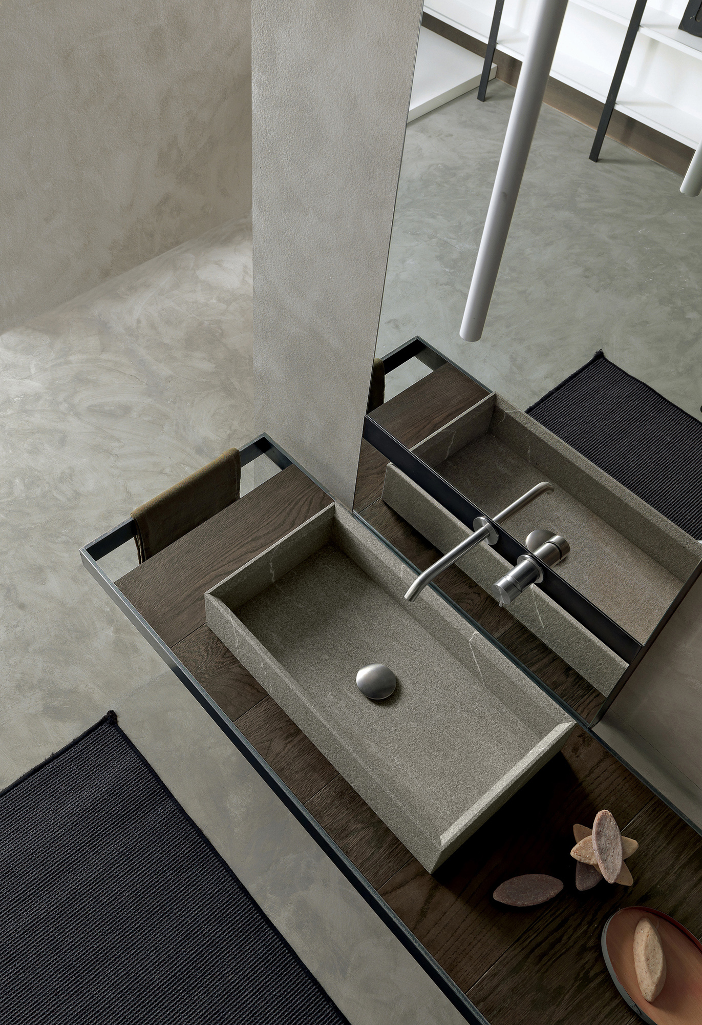 Sospeso su un elegante telaio in ferro nero e abbinato a un lavabo in pietra piasentina, Surf esprime carattere e unicità. L’equilibrio tra estetica e funzionalità rende questo programma ideale per chi desidera un bagno dal design essenziale ma distintivo, capace di valorizzare ogni spazio.