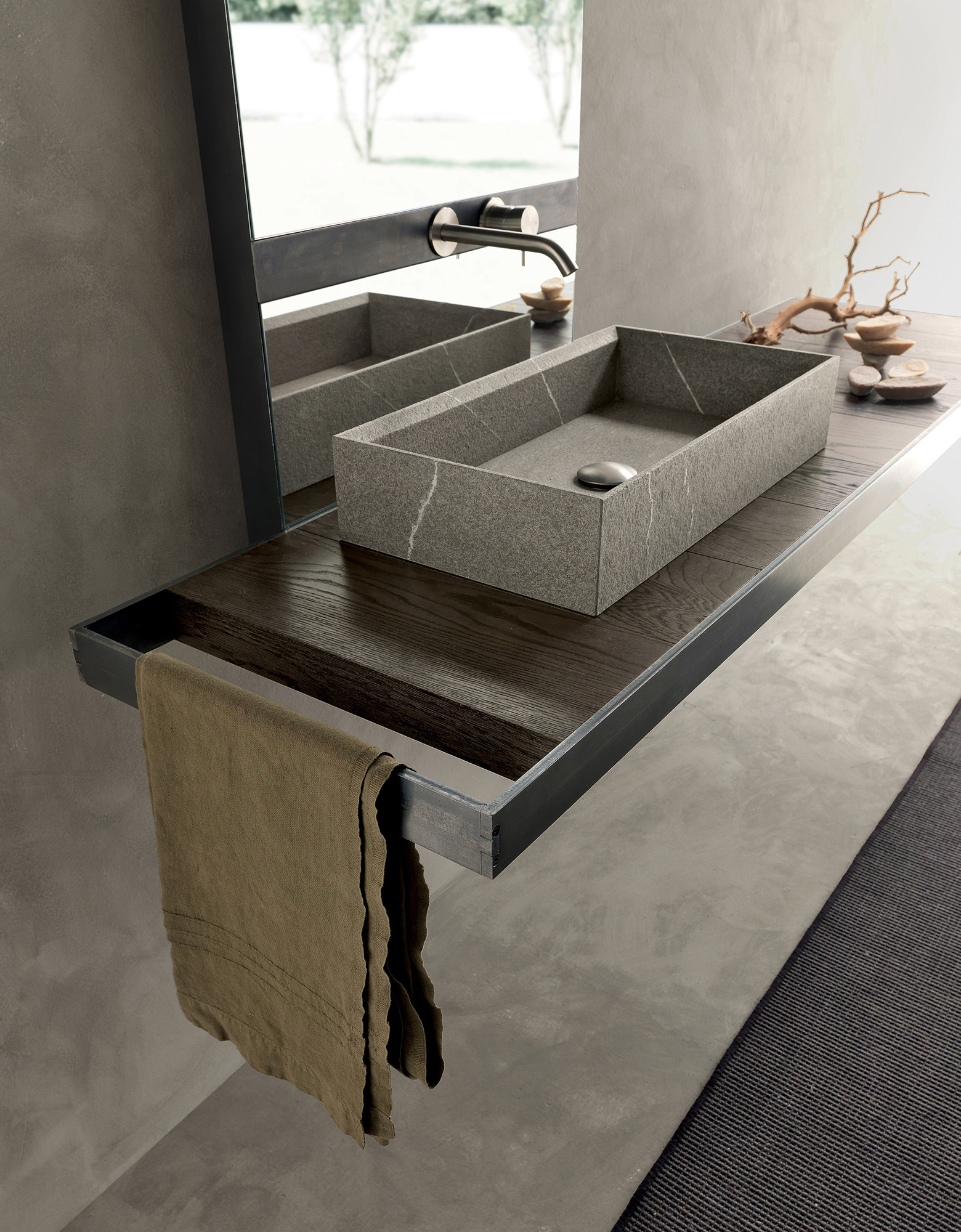 Il lavabo in pietra piasentina fiammata valorizza la composizione con un tocco materico e raffinato. La specchiera, arricchita da un inserto in ferro nero, integra la rubinetteria in modo elegante e funzionale, offrendo una soluzione innovativa per un bagno di design pratico e distintivo.