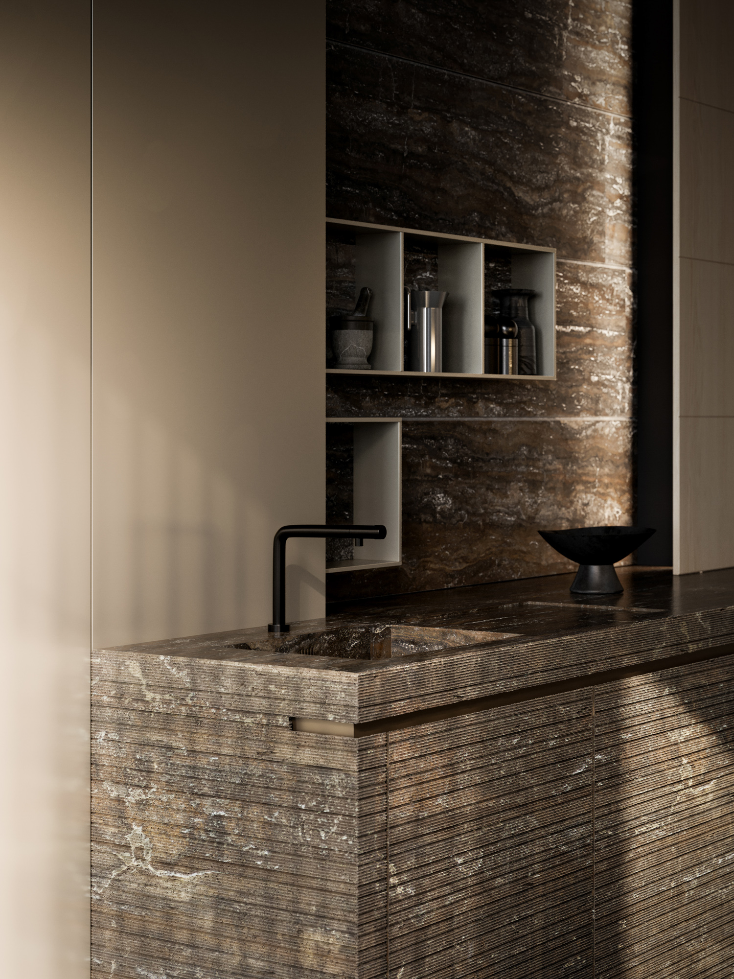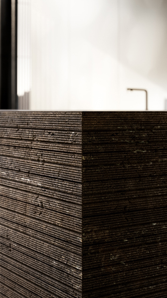 Twenty Lab presenta il Travertino Titanium, una materia stratificata e profonda che custodisce la memoria della terra. La nuova finitura tridimensionale Graf introduce nel sistema cucina una profondità finora riservata alle boiserie, rendendo la materia leggibile e architettonica.