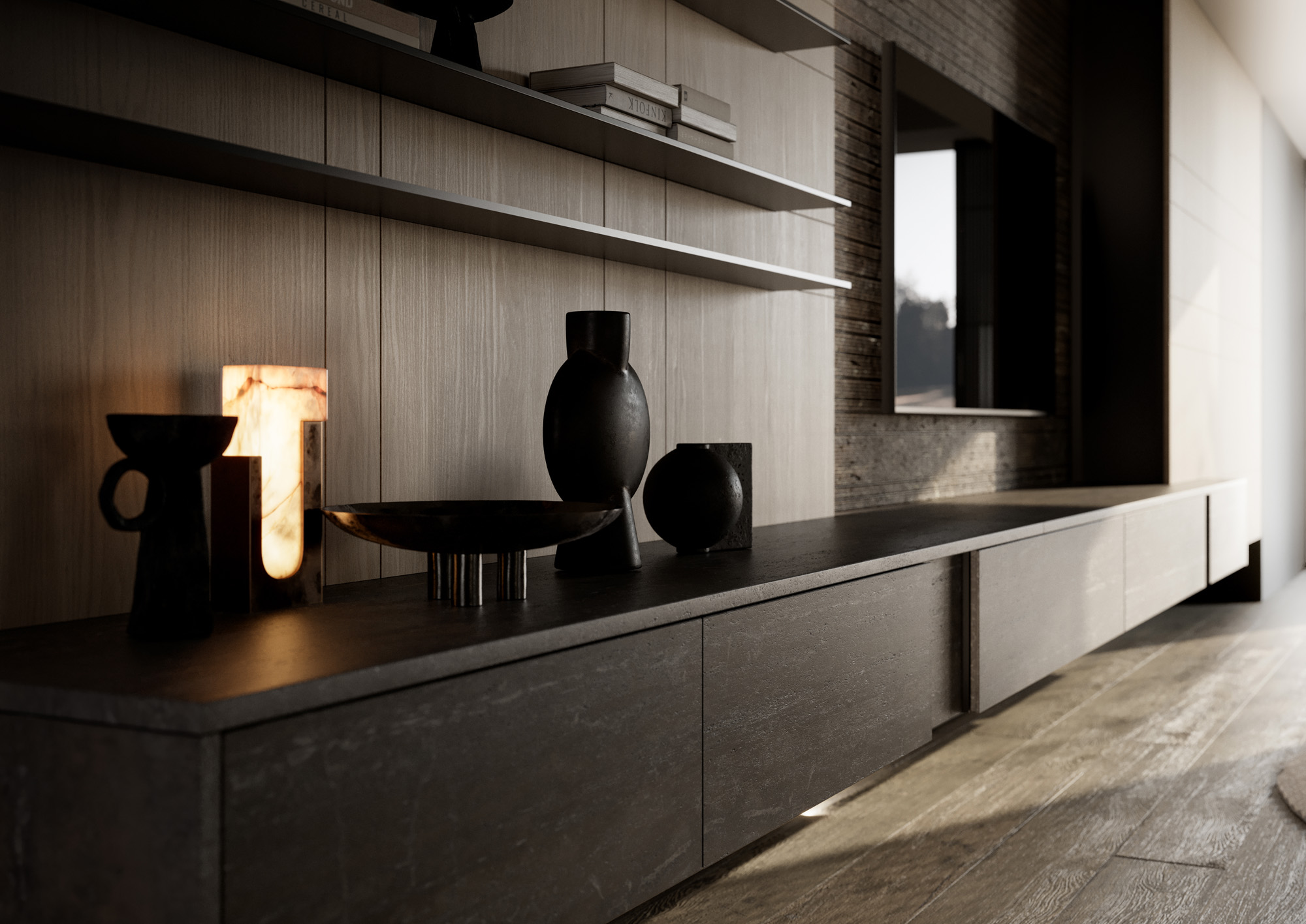 La boiserie Atelier arricchisce il living di nuove geometrie. In questa trama architettonica si innestano le mensole in metallo, mentre la base in  pietra Travertino Titanium racconta il sistema Vertical in una lettura tono su tono, tra purezza espressiva e presenza scultorea. Lo schienale in finitura Graf prolunga la materia nello spazio, dando forma a un’armonia narrativa e visiva di grande intensità.