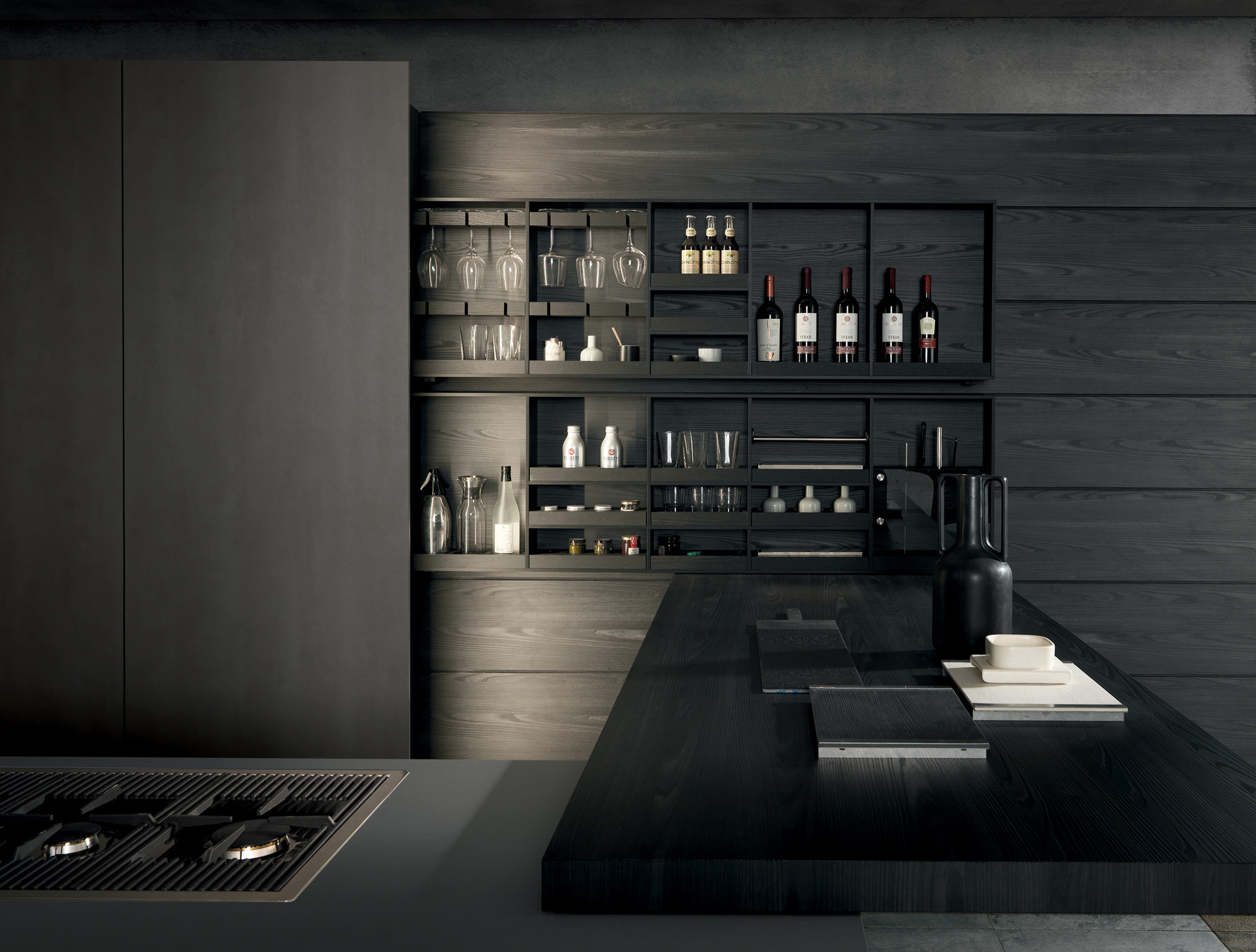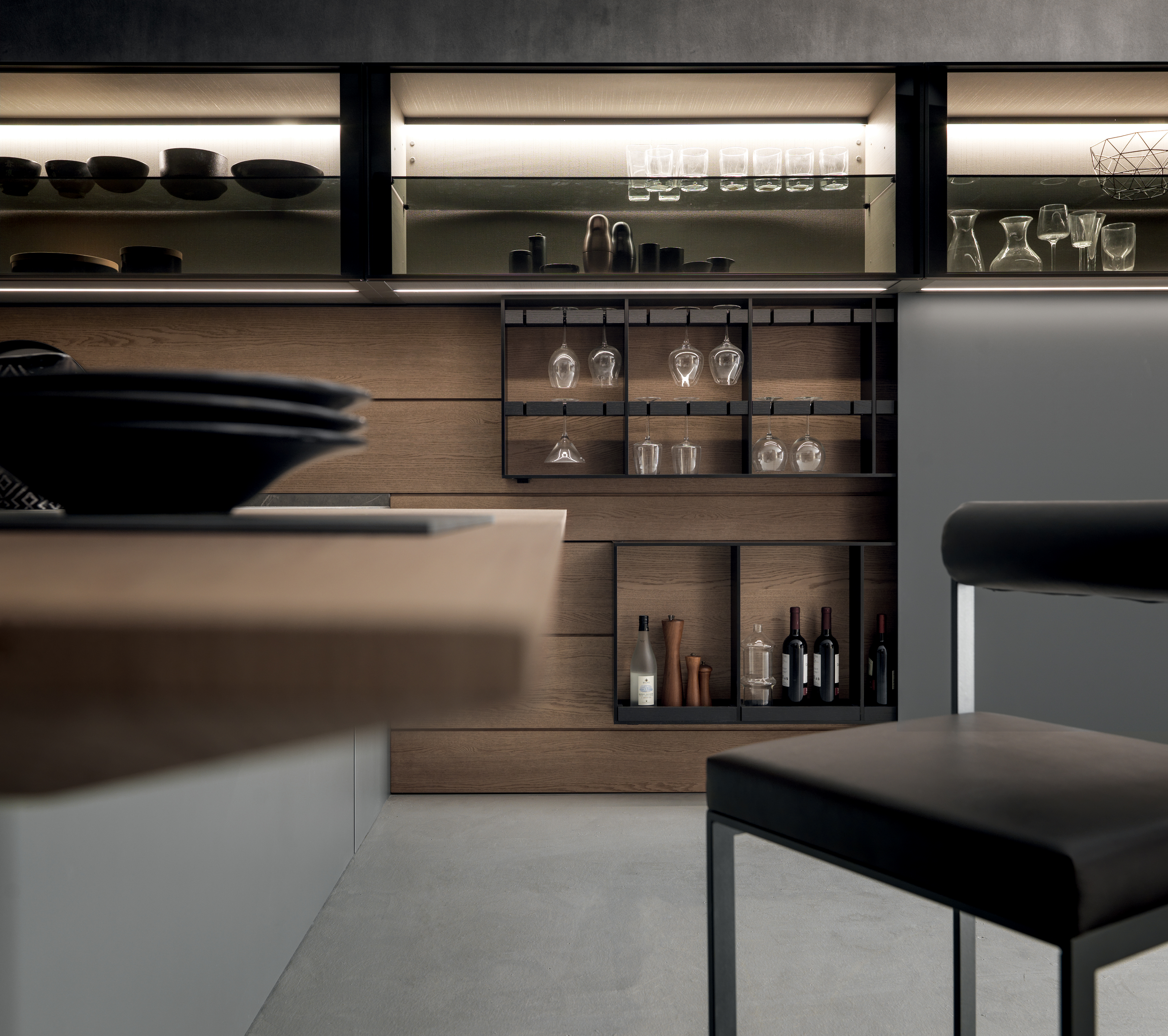 Wall contribuisce a mantenere la cucina pulita e ordinata, riducendo la presenza di elementi a vista e valorizzando la continuità delle superfici. Lo schienale, disponibile in diverse finiture come legno, vetro o materiali tecnici, diventa parte integrante del progetto e non un semplice fondo funzionale.