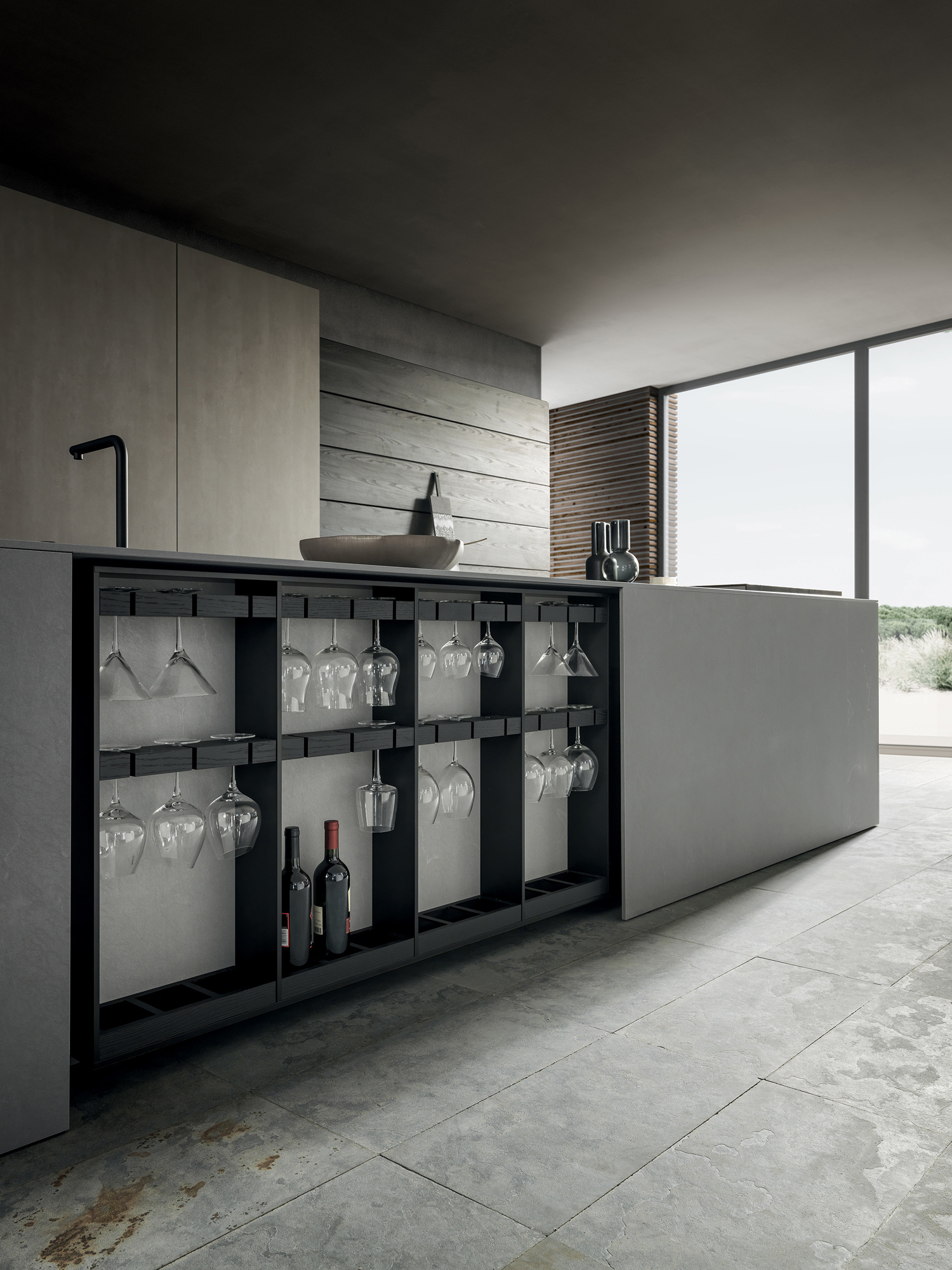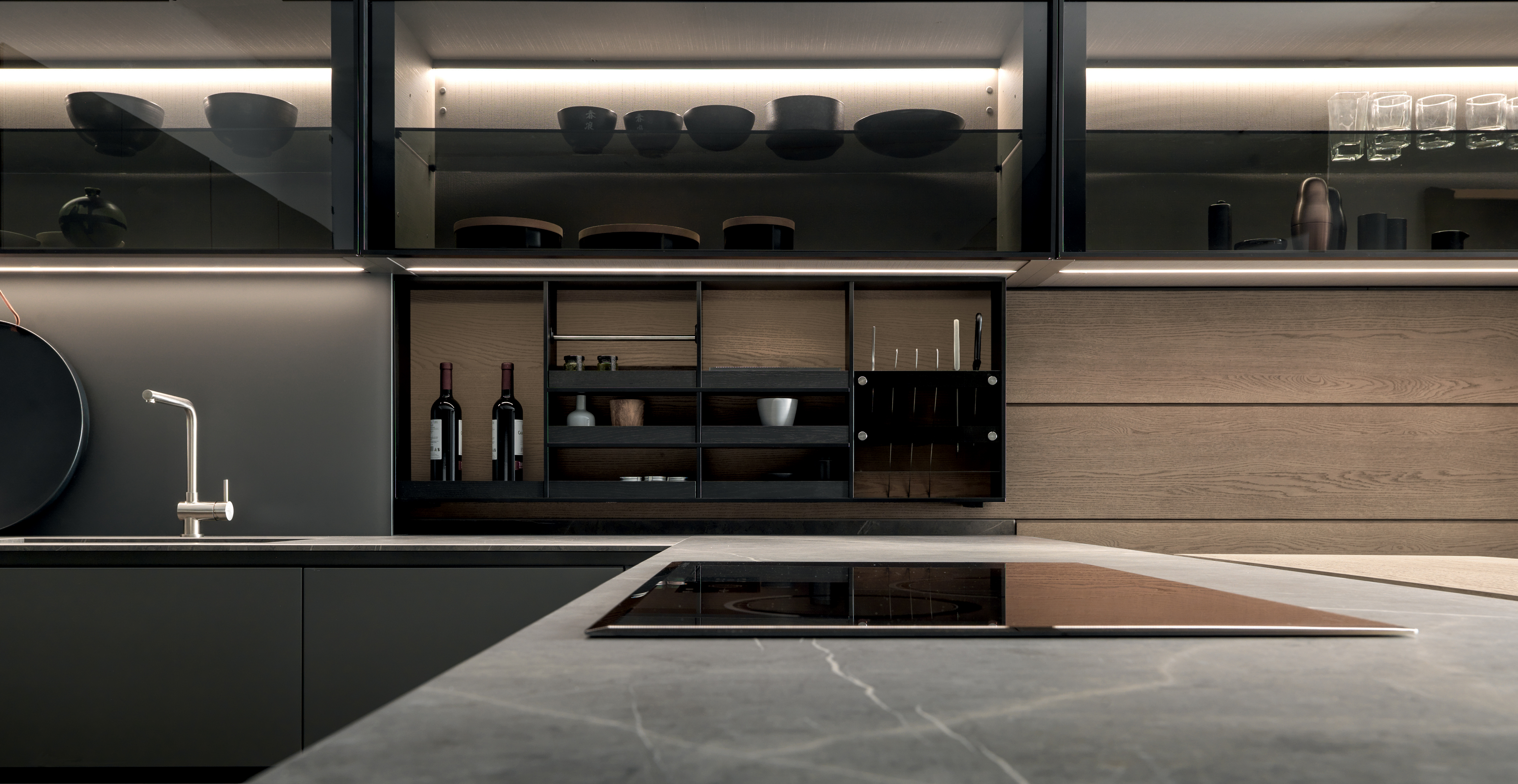 Il suo movimento orizzontale introduce una dimensione fluida all’interno della composizione cucina, generando un’interazione continua tra la zona operativa e quella contenitiva. In questo modo, lo spazio non è più rigidamente suddiviso, ma diventa modulabile e reattivo, capace di cambiare configurazione in funzione delle diverse fasi di utilizzo, dalla preparazione alla cottura.