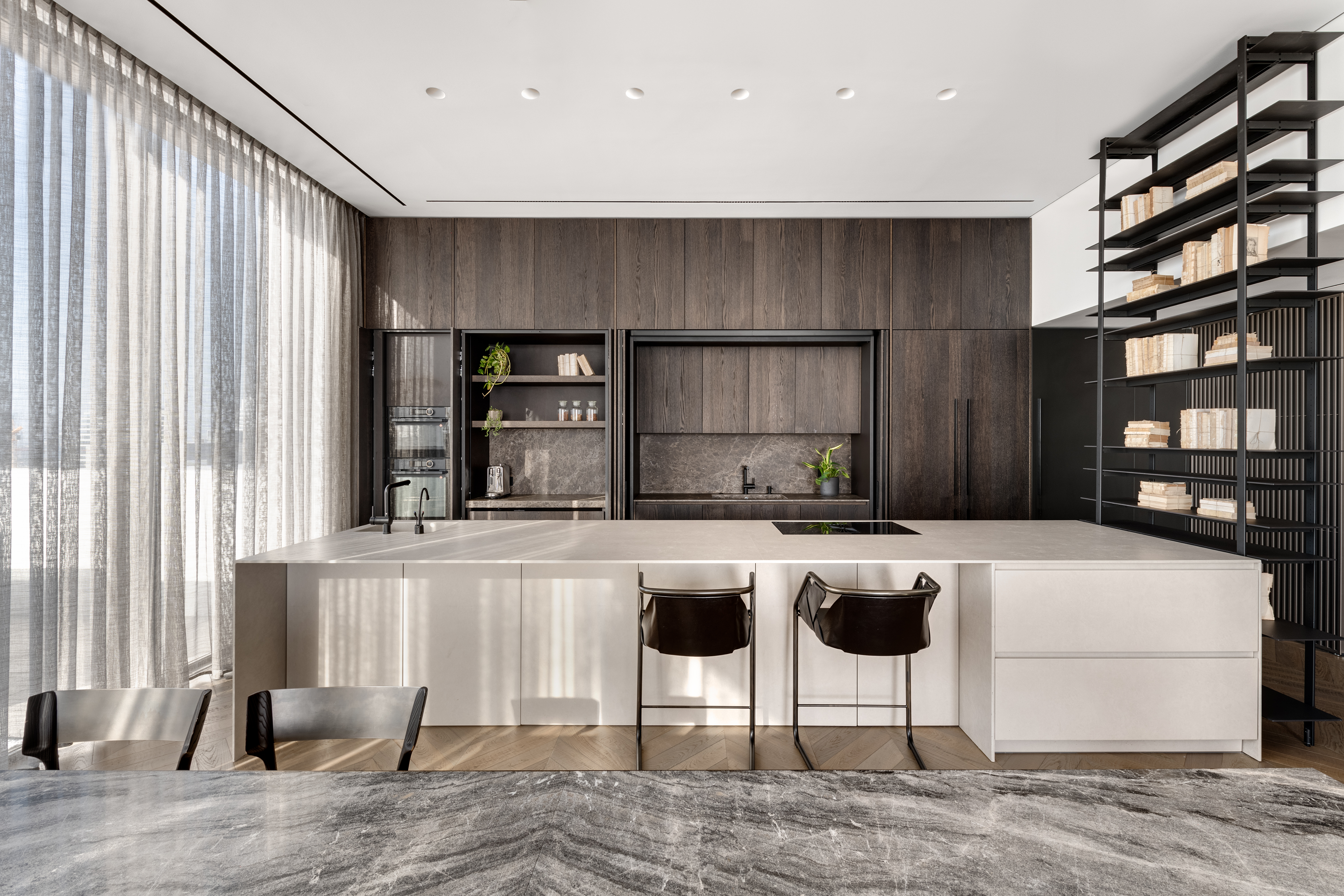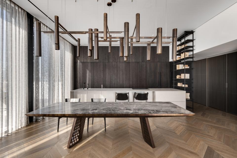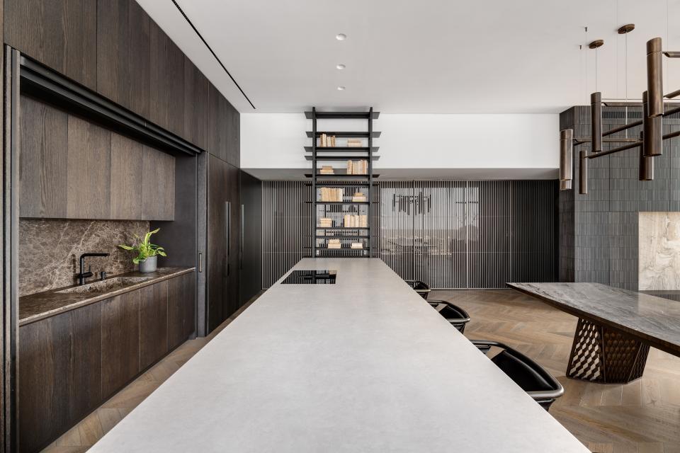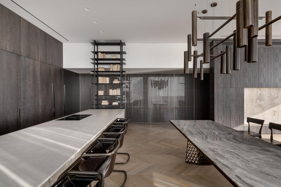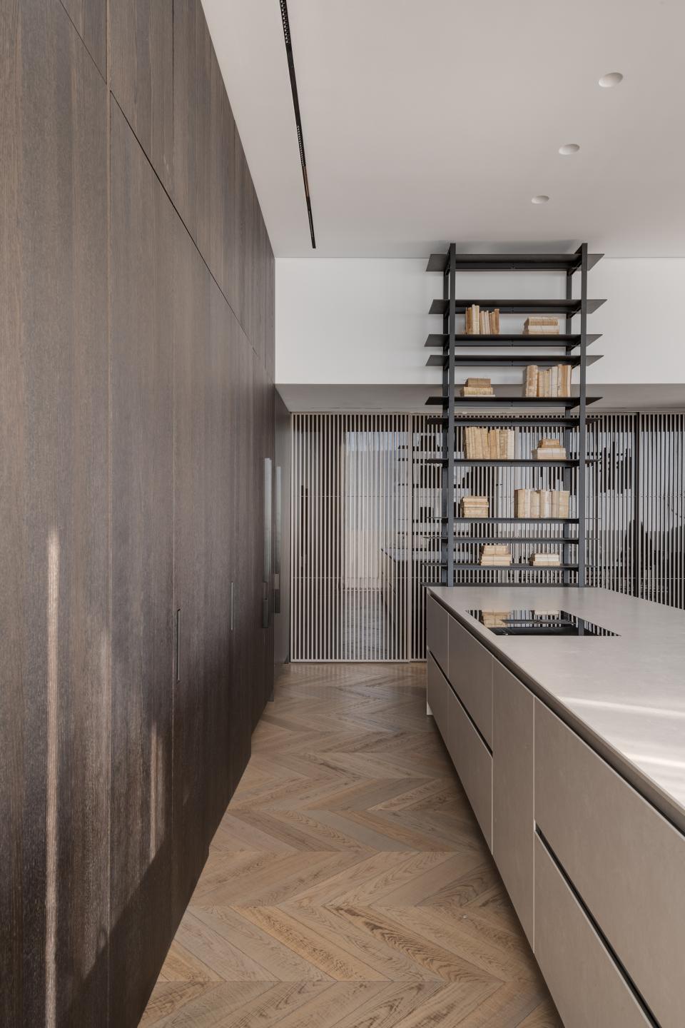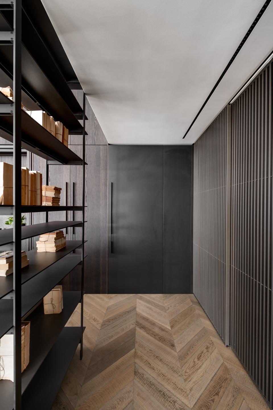 Materiali pieni, luce controllata, proporzioni nette. Lo spazio resta calmo, anche nei dettagli.