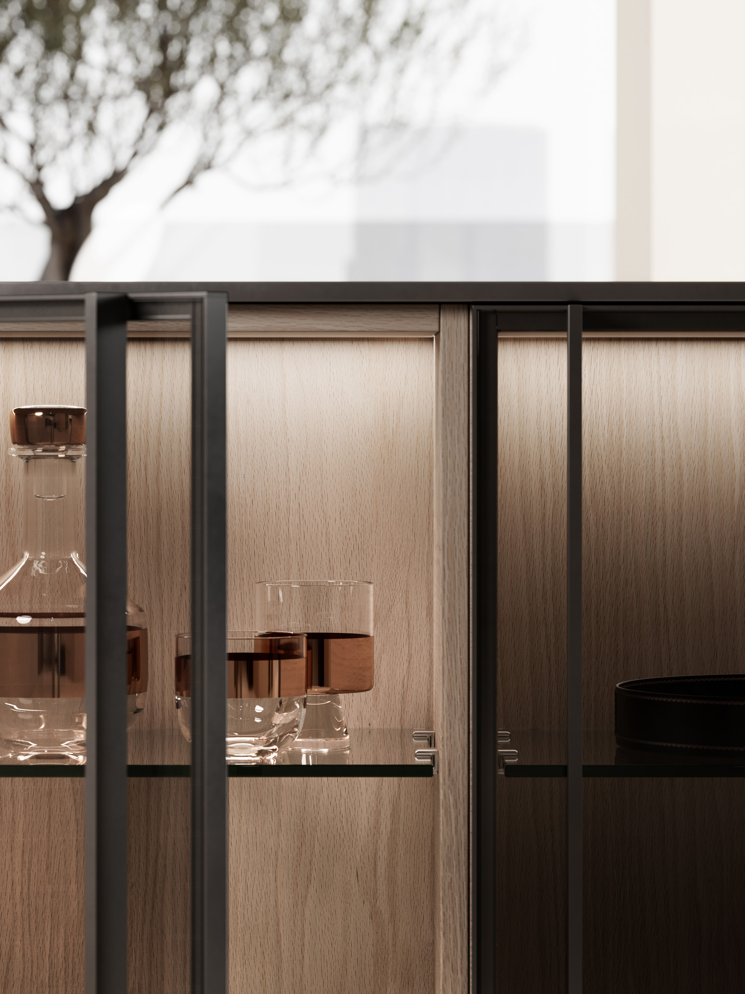 Con l'anta Glass, Modulnova porta il vetro dentro una dimensione progettuale più avanzata. La trasparenza incontra il rigore, la leggerezza si unisce alla precisione, la superficie raggiunge una nuova continuità visiva. Alla base, una tecnologia brevettata sviluppata per integrare la struttura all’interno del sistema e ridurne al minimo la presenza percettiva.