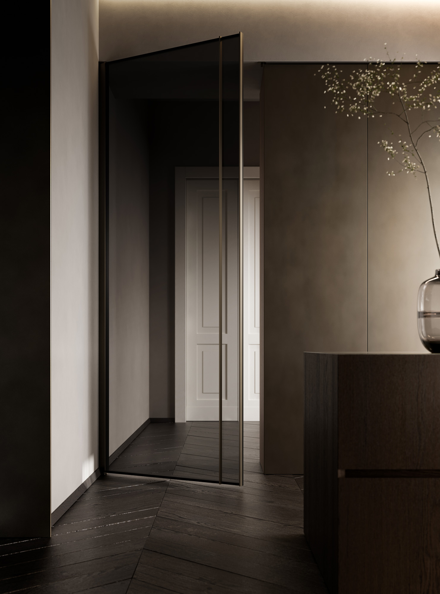 Il risultato è un’anta in cui la tecnica arretra e la purezza emerge. Il vetro acquista una nuova libertà espressiva, sostenuto da una costruzione che ne amplifica la forza estetica senza interromperne l’essenzialità. Un’innovazione che trasforma la complessità in leggerezza visiva e apre a una nuova idea di eleganza architettonica.