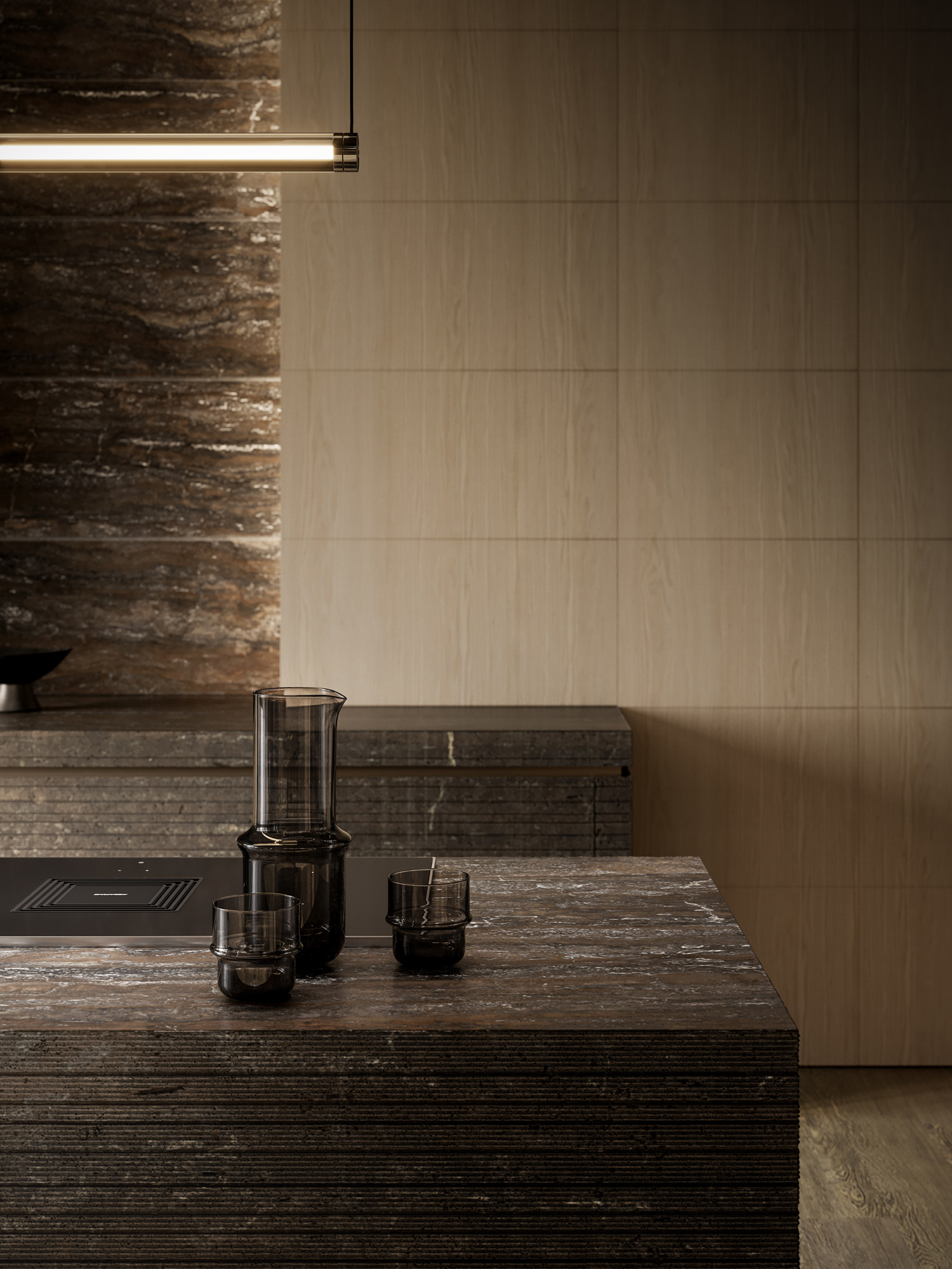 La ricerca Modulnova sulla pietra nasce dalla volontà di ampliare le possibilità del progetto, portando un materiale naturalmente pieno e materico verso una nuova libertà applicativa. Attraverso lo sviluppo di soluzioni costruttive dedicate, la pietra mantiene intatta la propria forza espressiva, ma acquisisce una leggerezza strutturale che ne rende possibile un impiego più evoluto. In Blade Lab questa innovazione trova una delle sue espressioni più avanzate. L’anta in pietra, marmo o granito viene realizzata a partire da una lastra scavata e integrata con un pannello in alveolare di alluminio, in uno spessore di 15 mm.