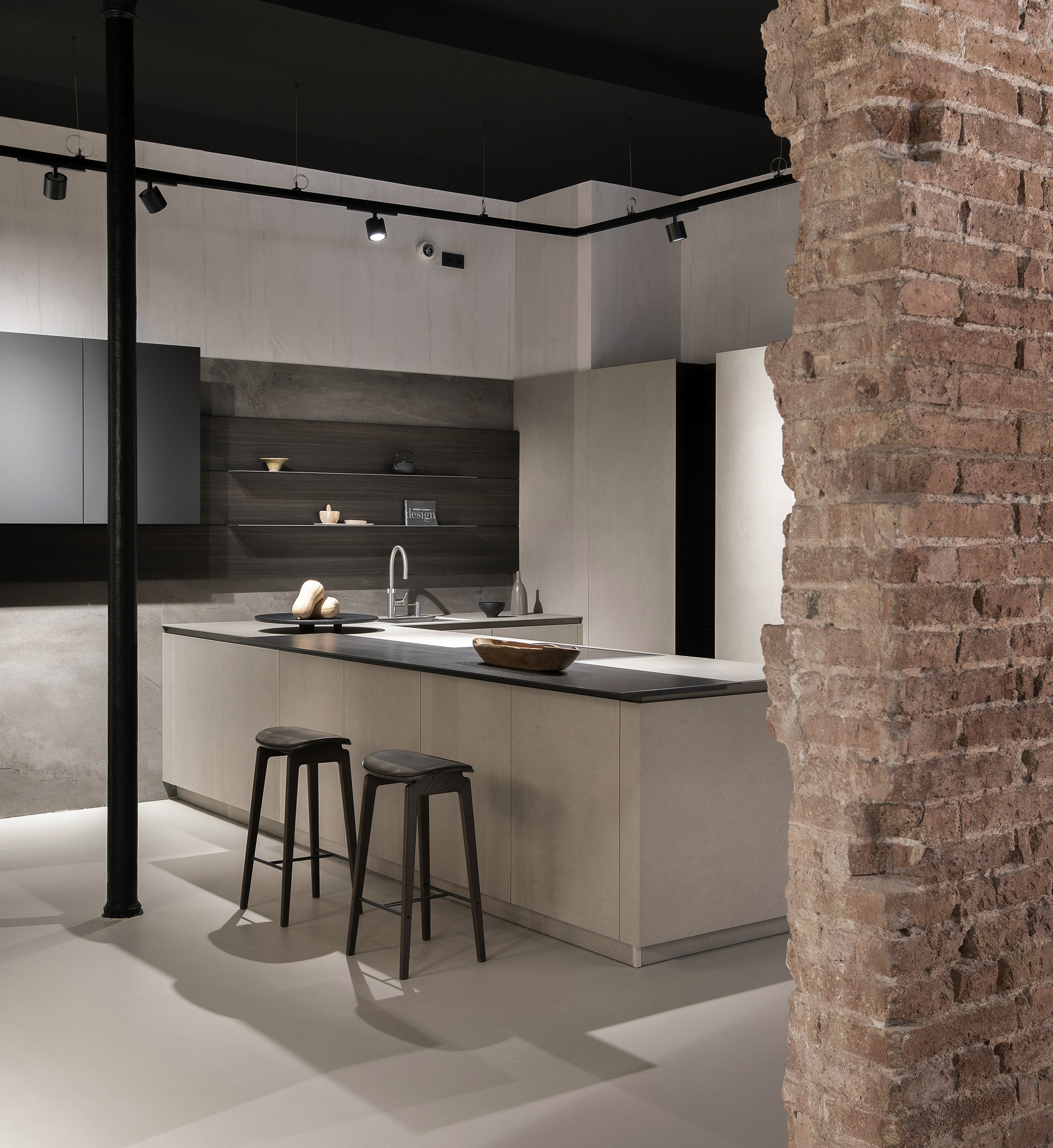 Un grande tavolo XY in impiallacciato di legno Rovere Fumo segna il passaggio verso le altre due nuove composizioni presenti in showroom: una sistema parete living Skill/MH6 con pensili in Milltech Lead Grey, così come le ante delle basi, mentre le mensole sono in Noce Cenere e lo schienale della tv in marmo Moon Grey; e un sistema cucina Concept dove colonne in Noce Cenere e Lead Grey si abbinano a basi con anta Skill Gres Moon Grey, materiale utilizzato anche per la boiserie che ospita la televisione.