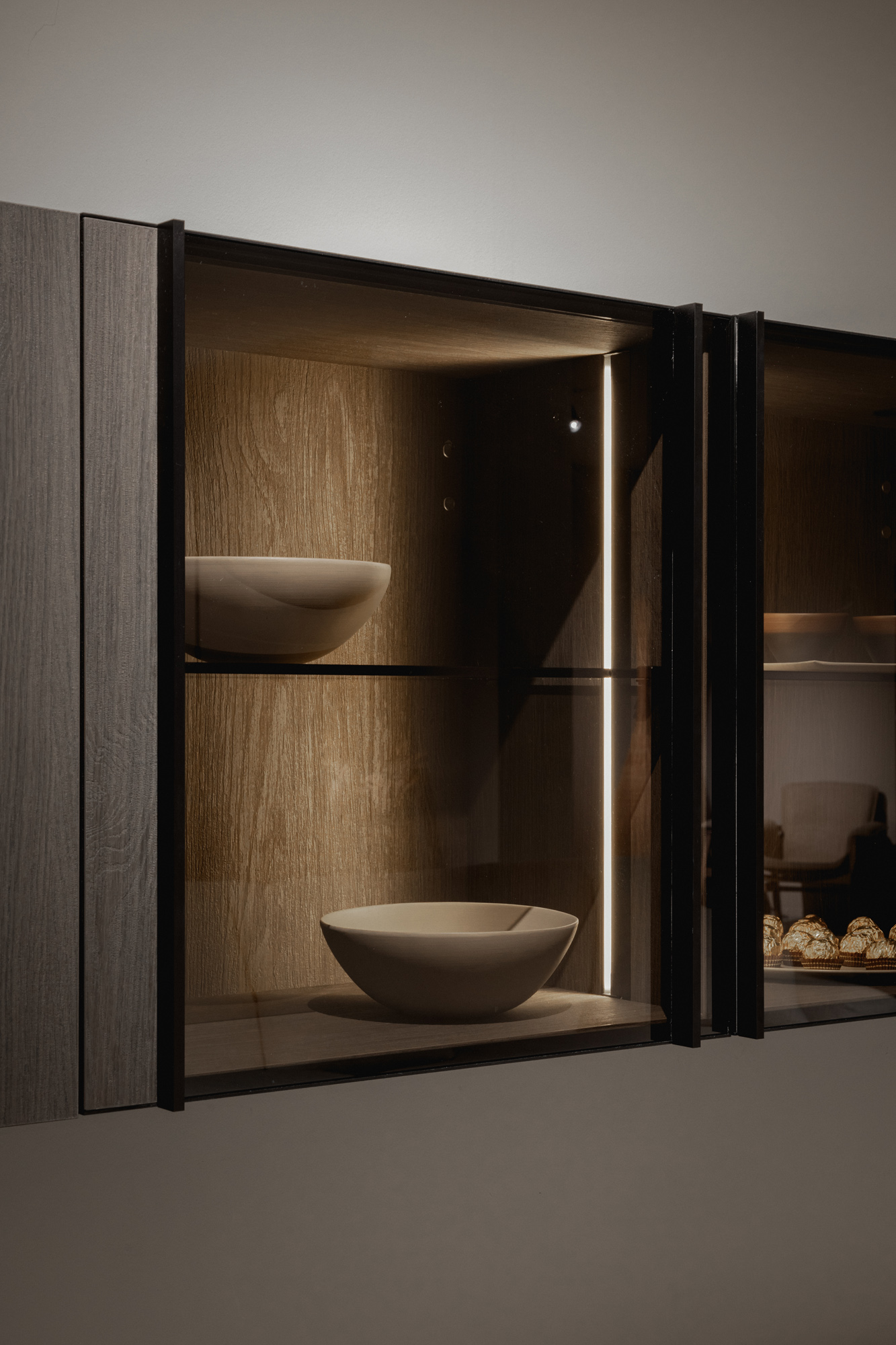 La cucina Blade Lab, penisola Infinity, cabina Glass ante rientranti