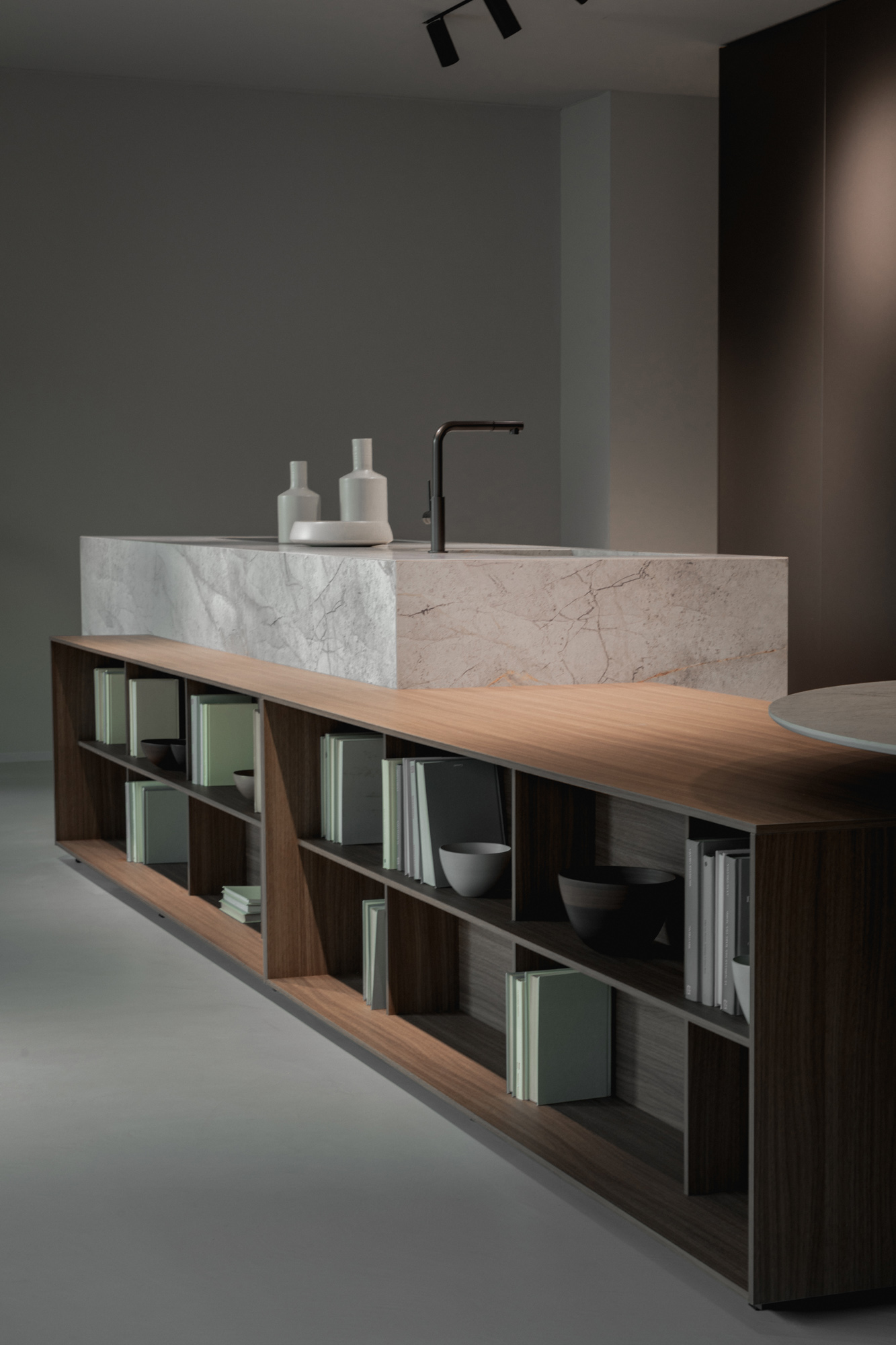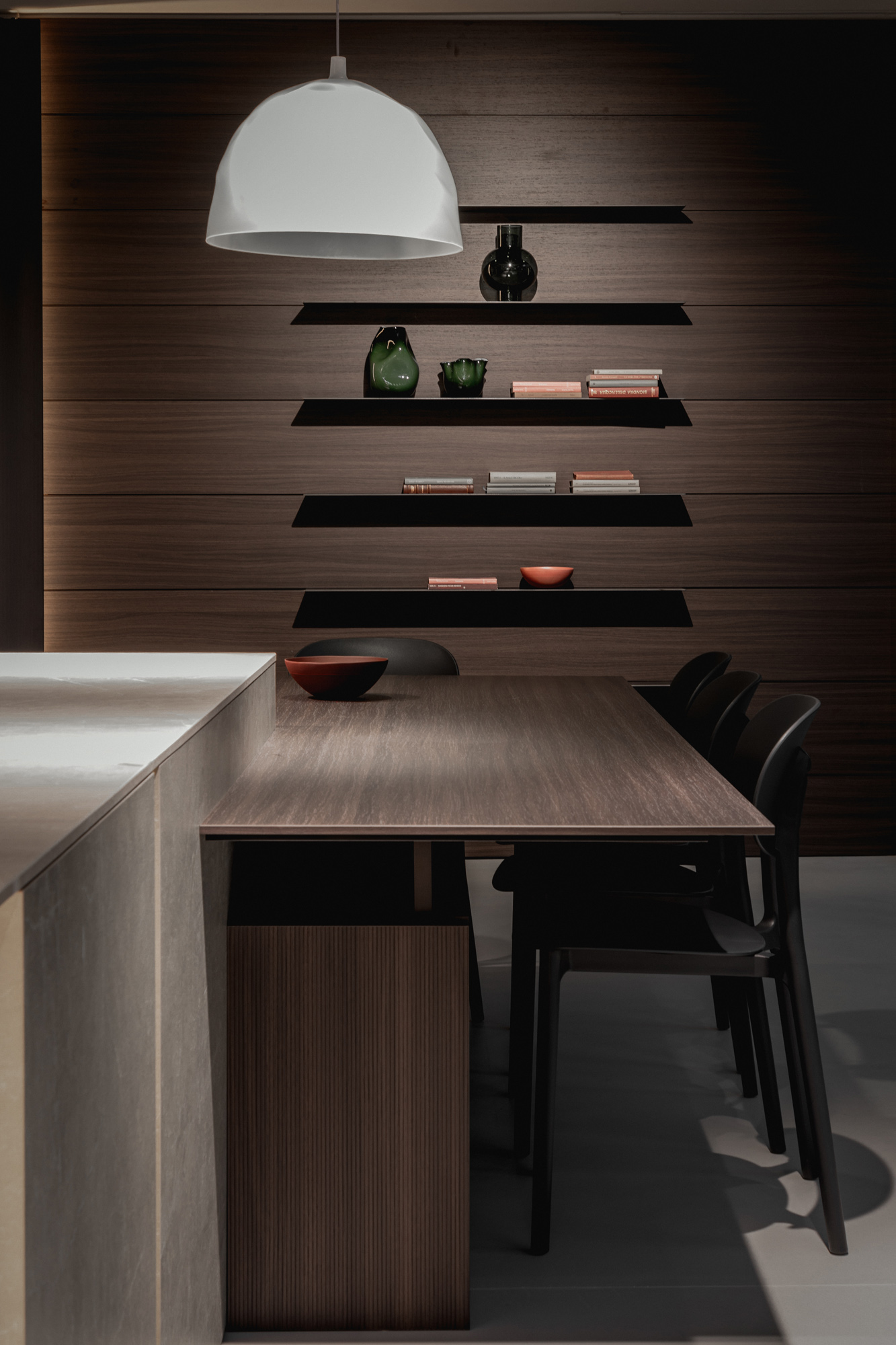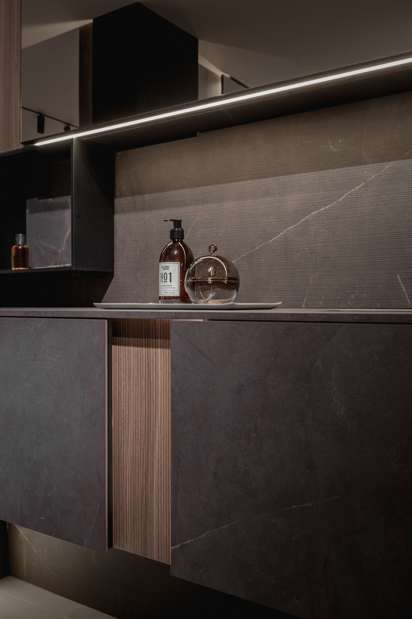 I materiali sono selezionati per le loro qualità estetiche e performative: pietre naturali dalle venature profonde, legni dalle texture autentiche e tattili, laccati opachi che restituiscono superfici continue e minimali, fino a metalli e finiture tecniche che introducono accenti contemporanei e raffinati. La lavorazione accurata esalta la matericità senza comprometterne la pulizia formale, creando un linguaggio coerente e sofisticato.
