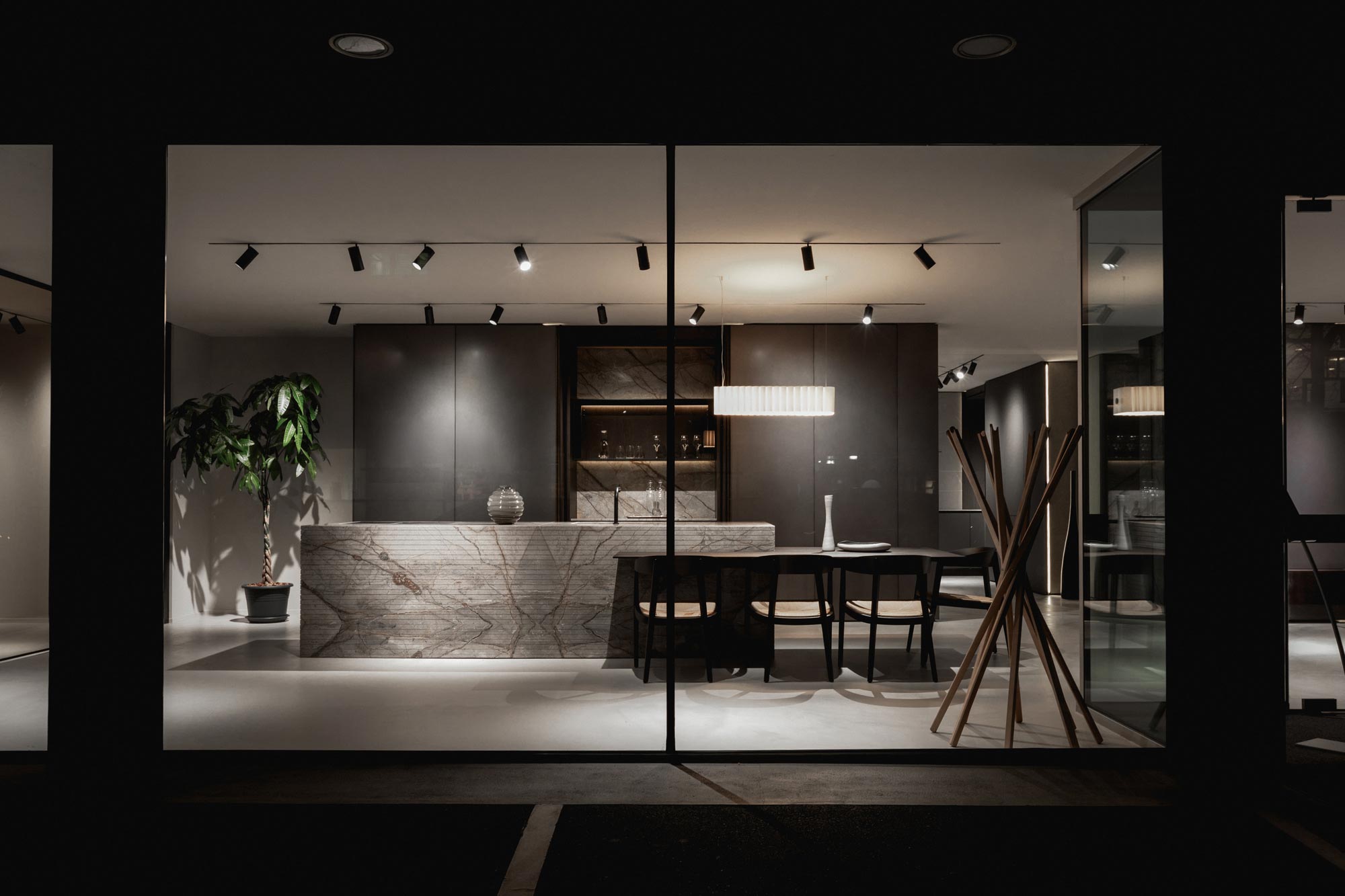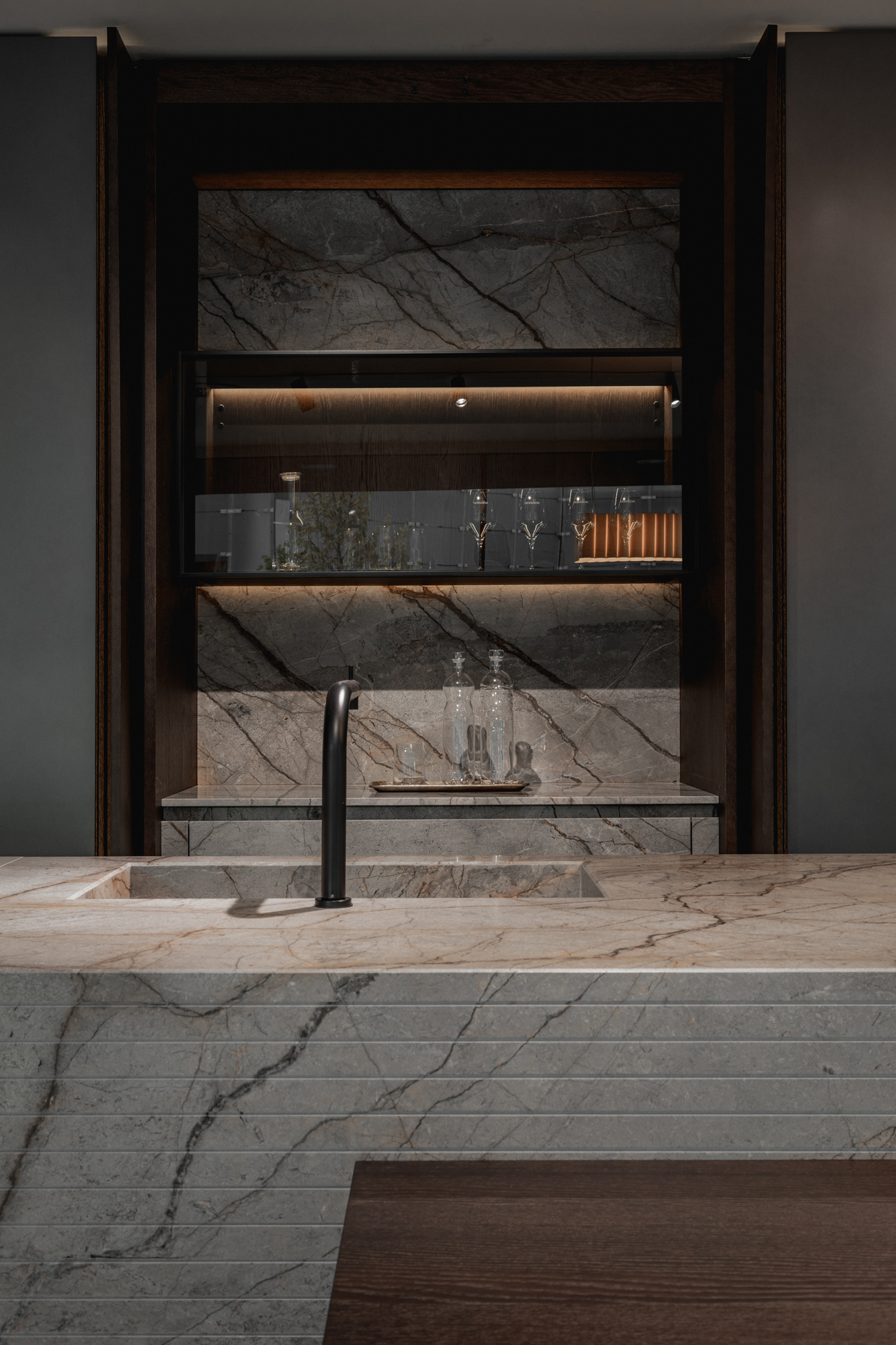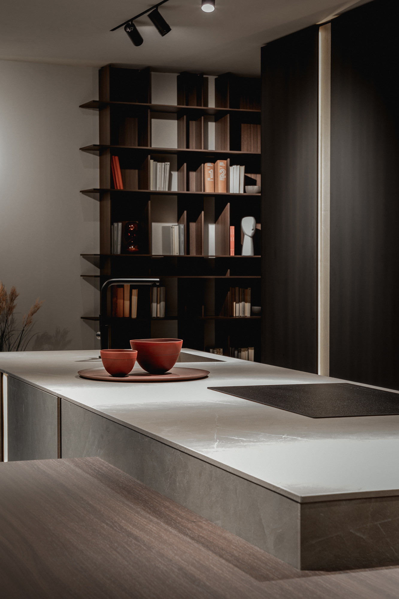 I materiali sono selezionati per le loro qualità estetiche e performative: pietre naturali dalle venature profonde, legni dalle texture autentiche e tattili, laccati opachi che restituiscono superfici continue e minimali, fino a metalli e finiture tecniche che introducono accenti contemporanei e raffinati. La lavorazione accurata esalta la matericità senza comprometterne la pulizia formale, creando un linguaggio coerente e sofisticato.