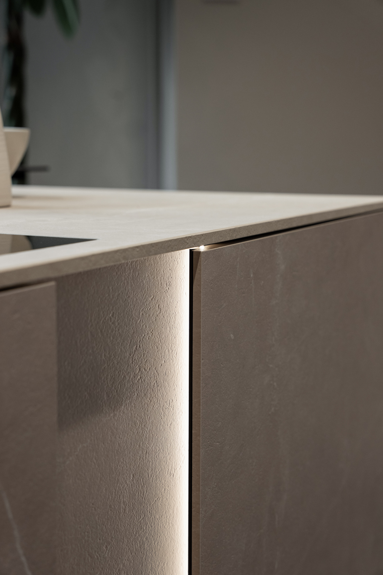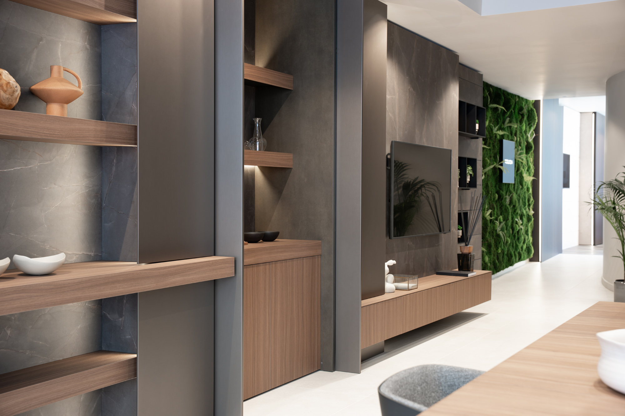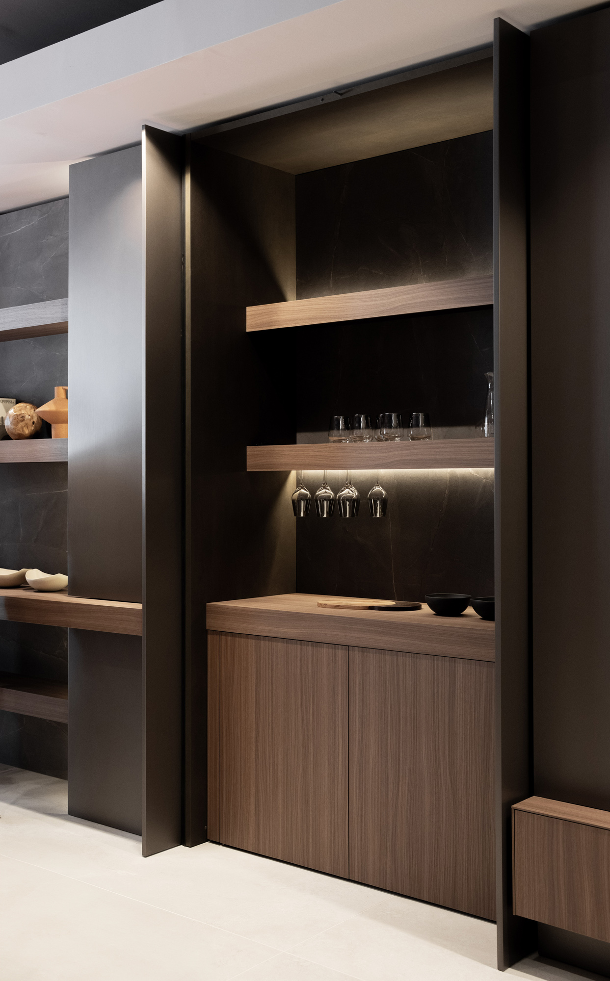 I materiali sono selezionati per le loro qualità estetiche e performative: pietre naturali dalle venature profonde, legni dalle texture autentiche e tattili, laccati opachi che restituiscono superfici continue e minimali, fino a metalli e finiture tecniche che introducono accenti contemporanei e raffinati. La lavorazione accurata esalta la matericità senza comprometterne la pulizia formale, creando un linguaggio coerente e sofisticato.