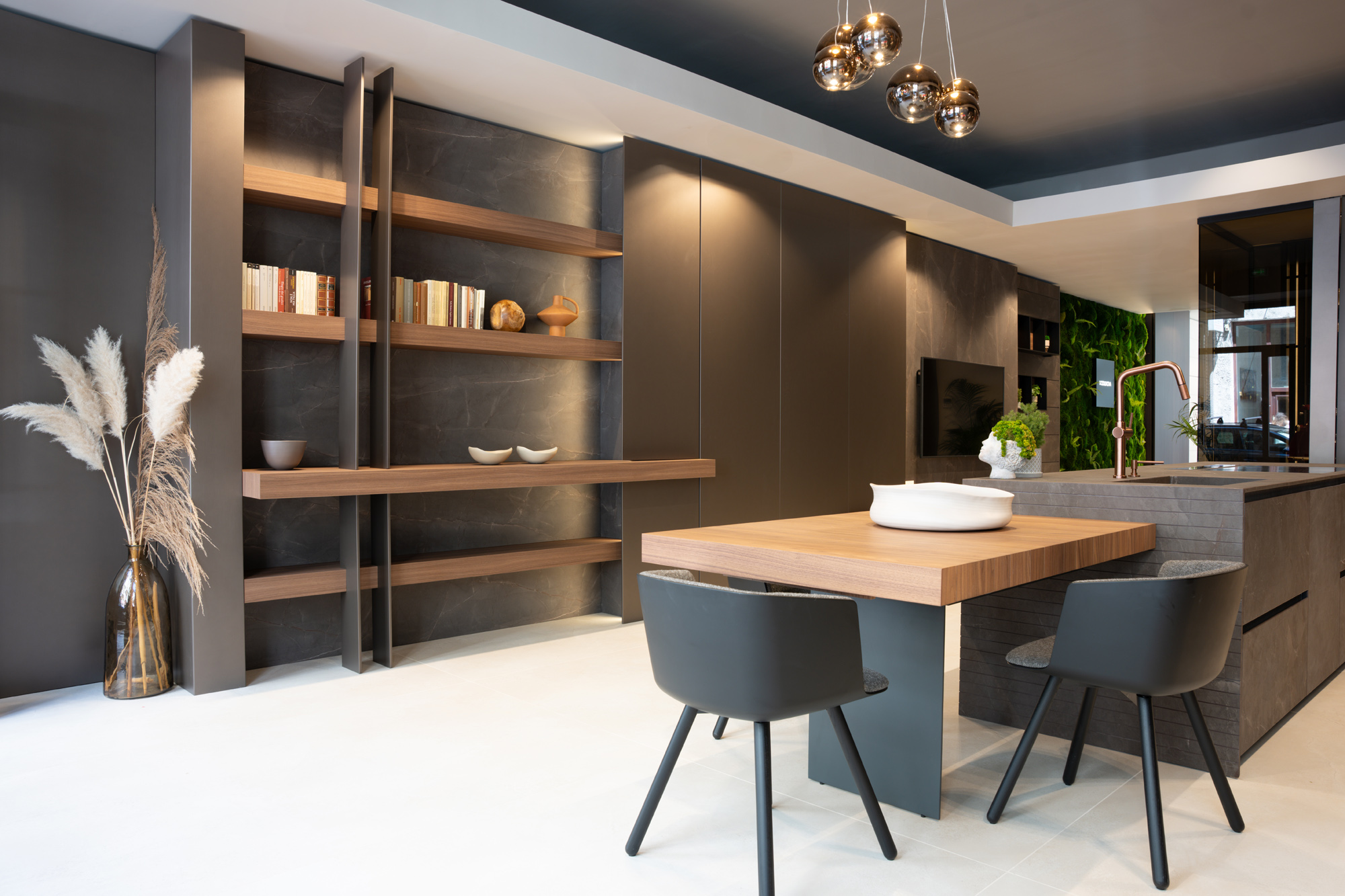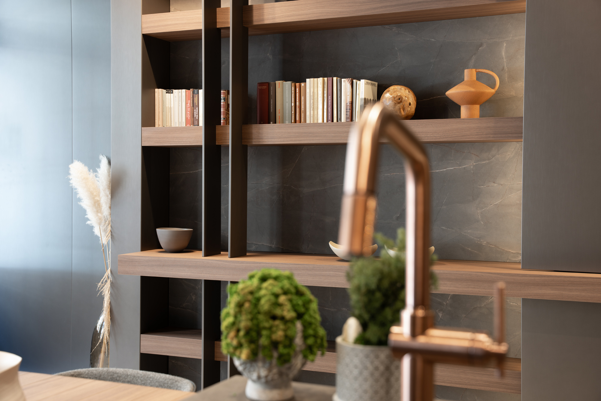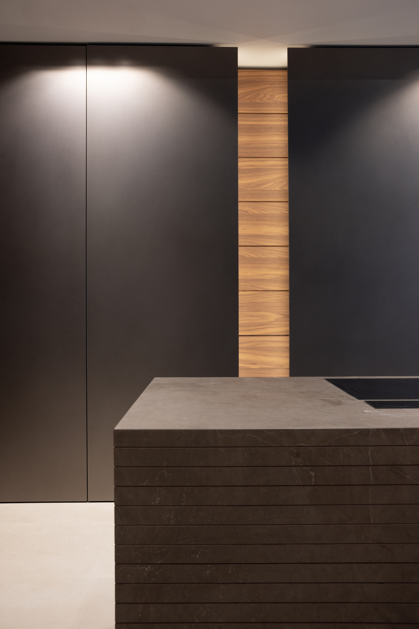 I materiali sono selezionati per le loro qualità estetiche e performative: pietre naturali dalle venature profonde, legni dalle texture autentiche e tattili, laccati opachi che restituiscono superfici continue e minimali, fino a metalli e finiture tecniche che introducono accenti contemporanei e raffinati. La lavorazione accurata esalta la matericità senza comprometterne la pulizia formale, creando un linguaggio coerente e sofisticato.