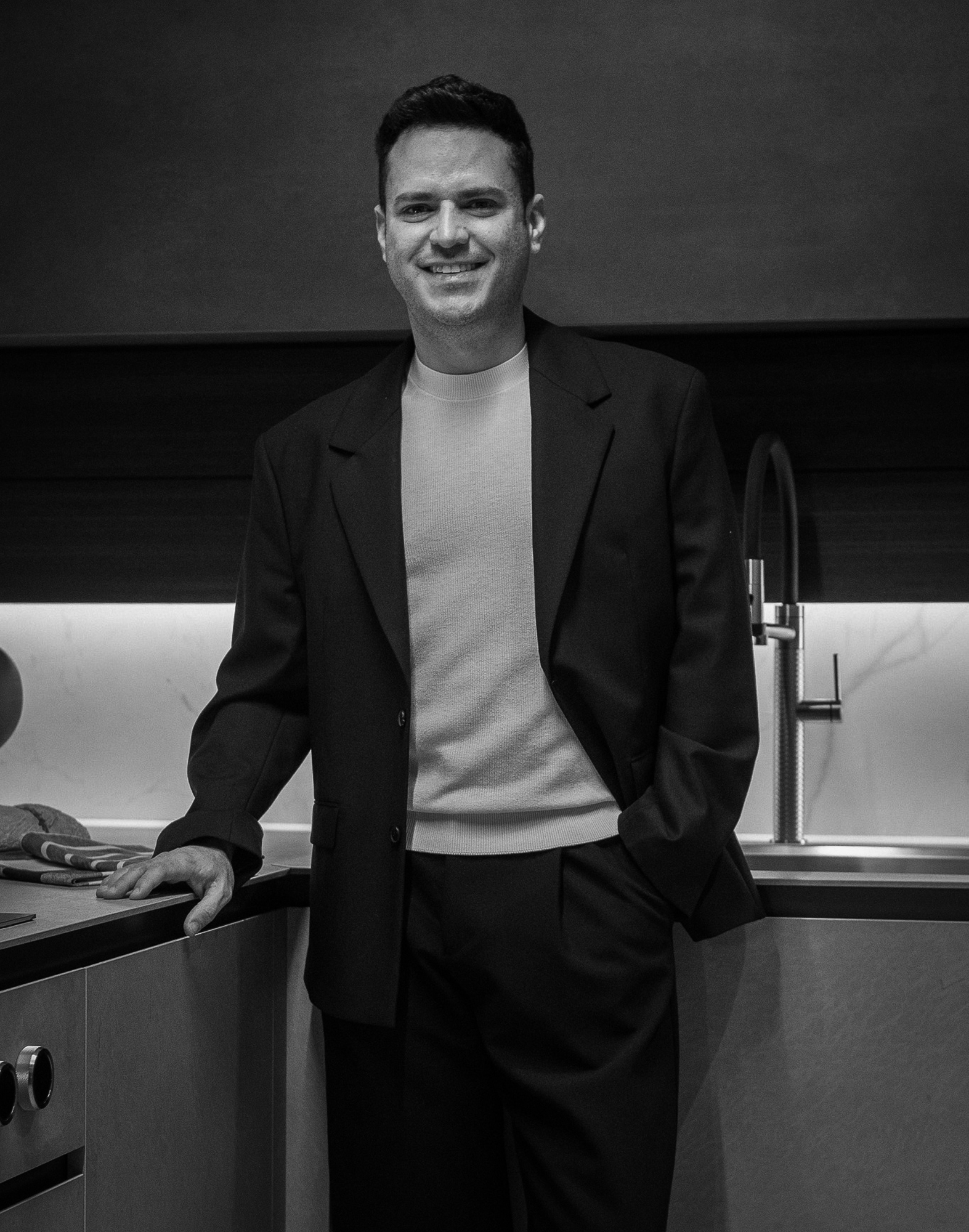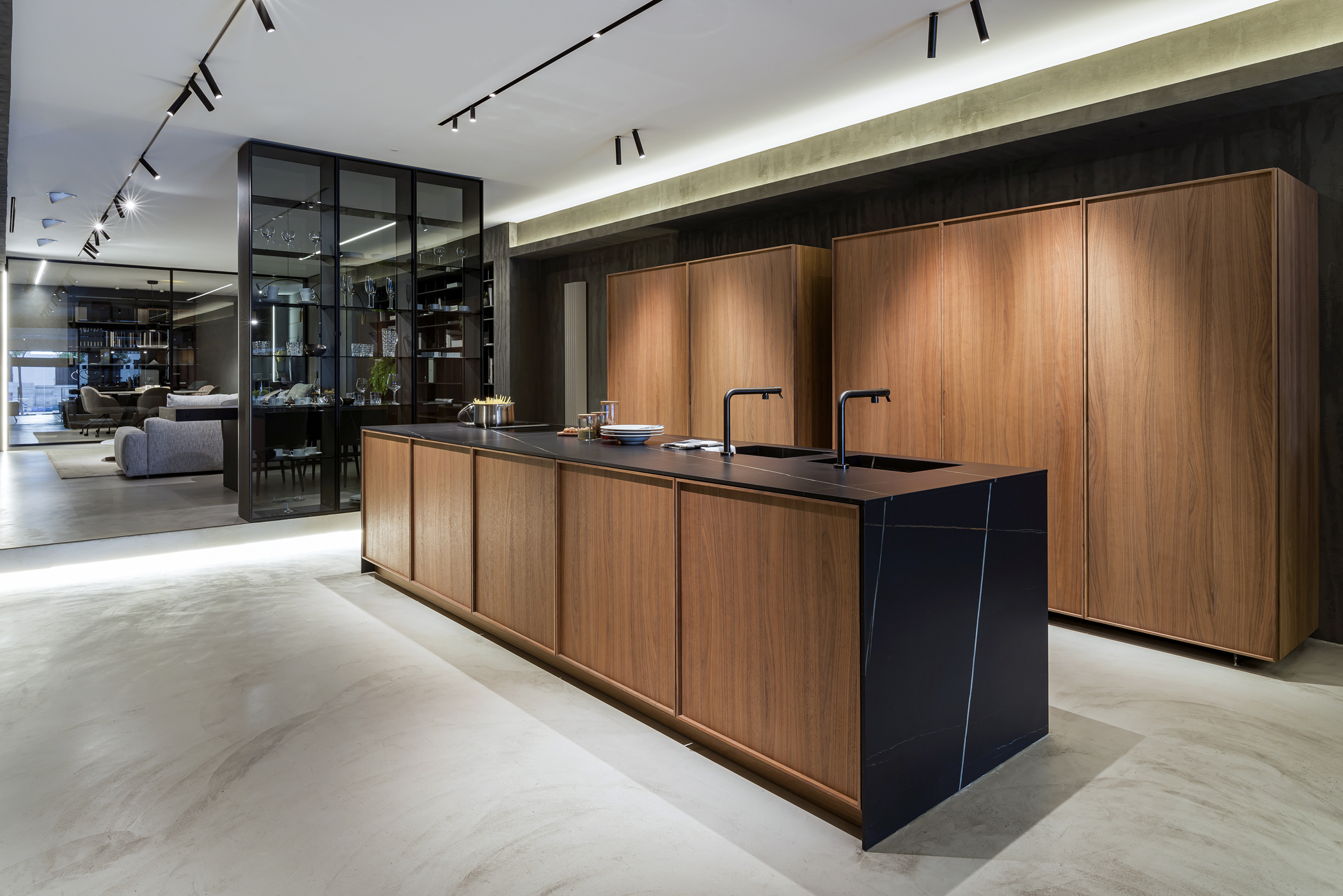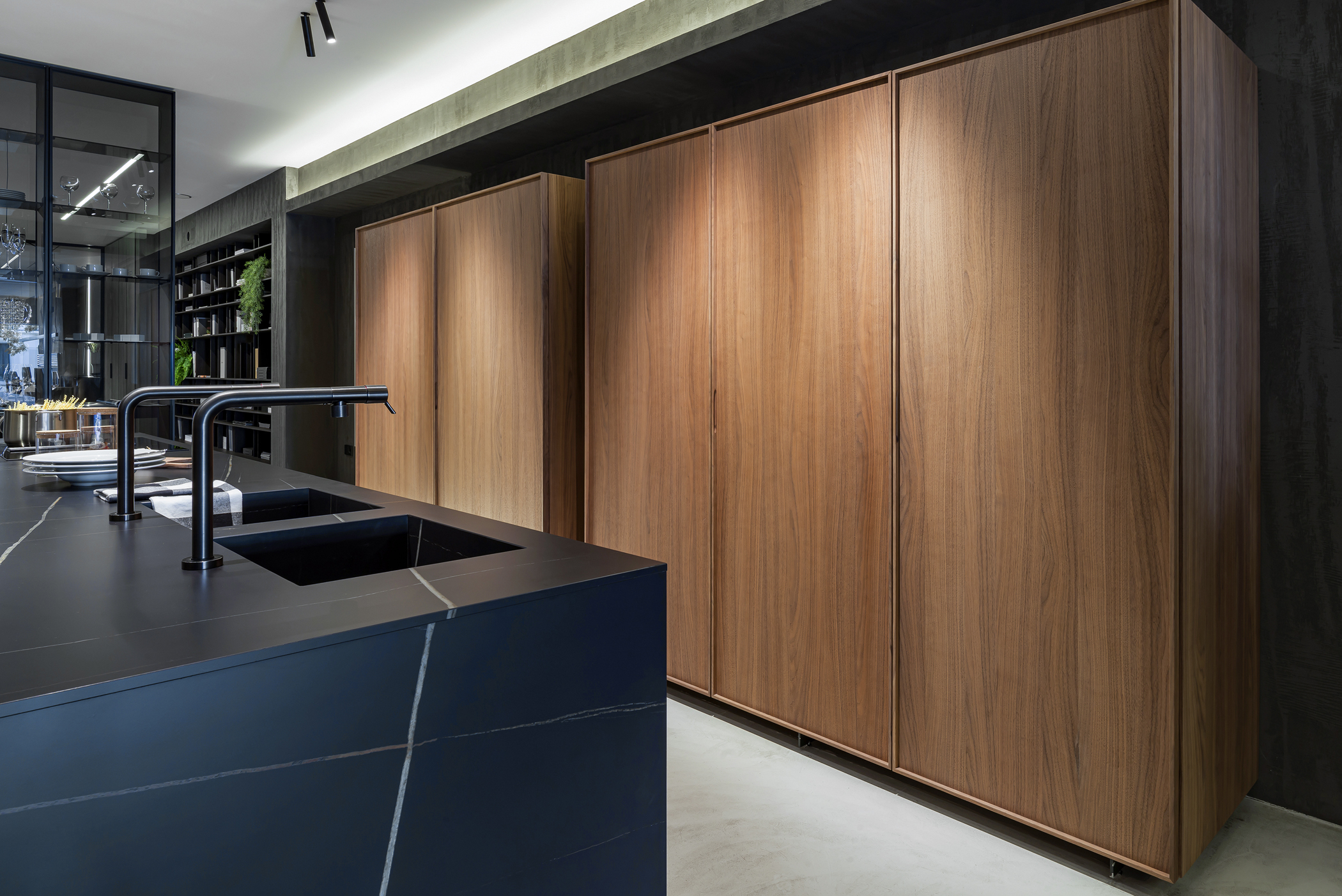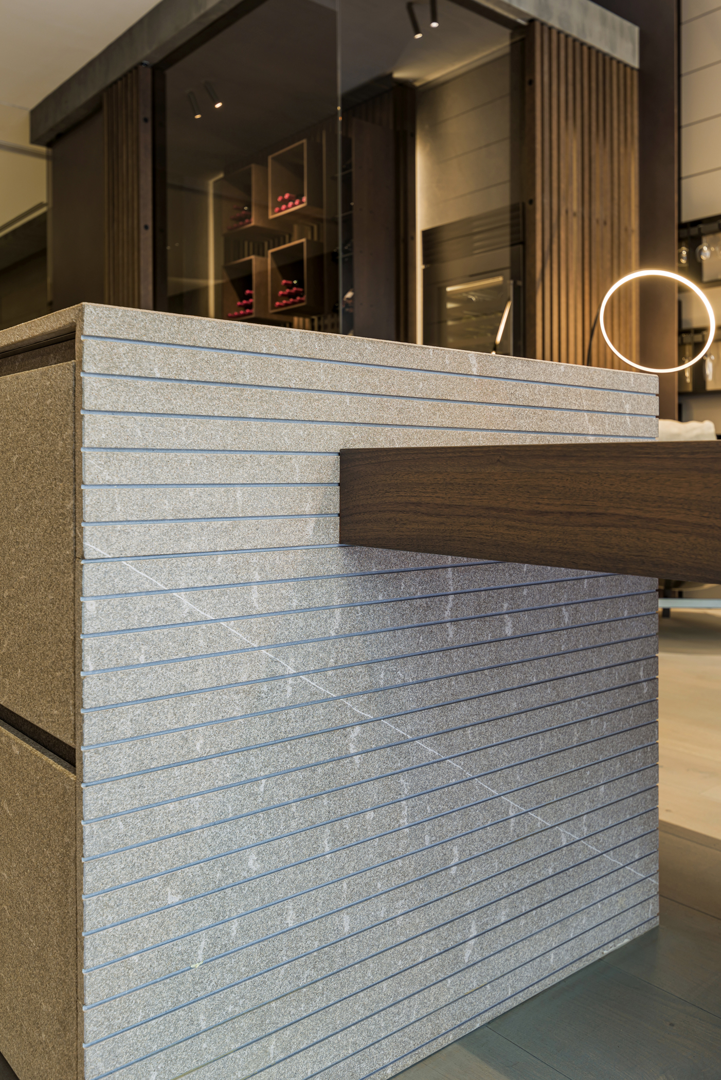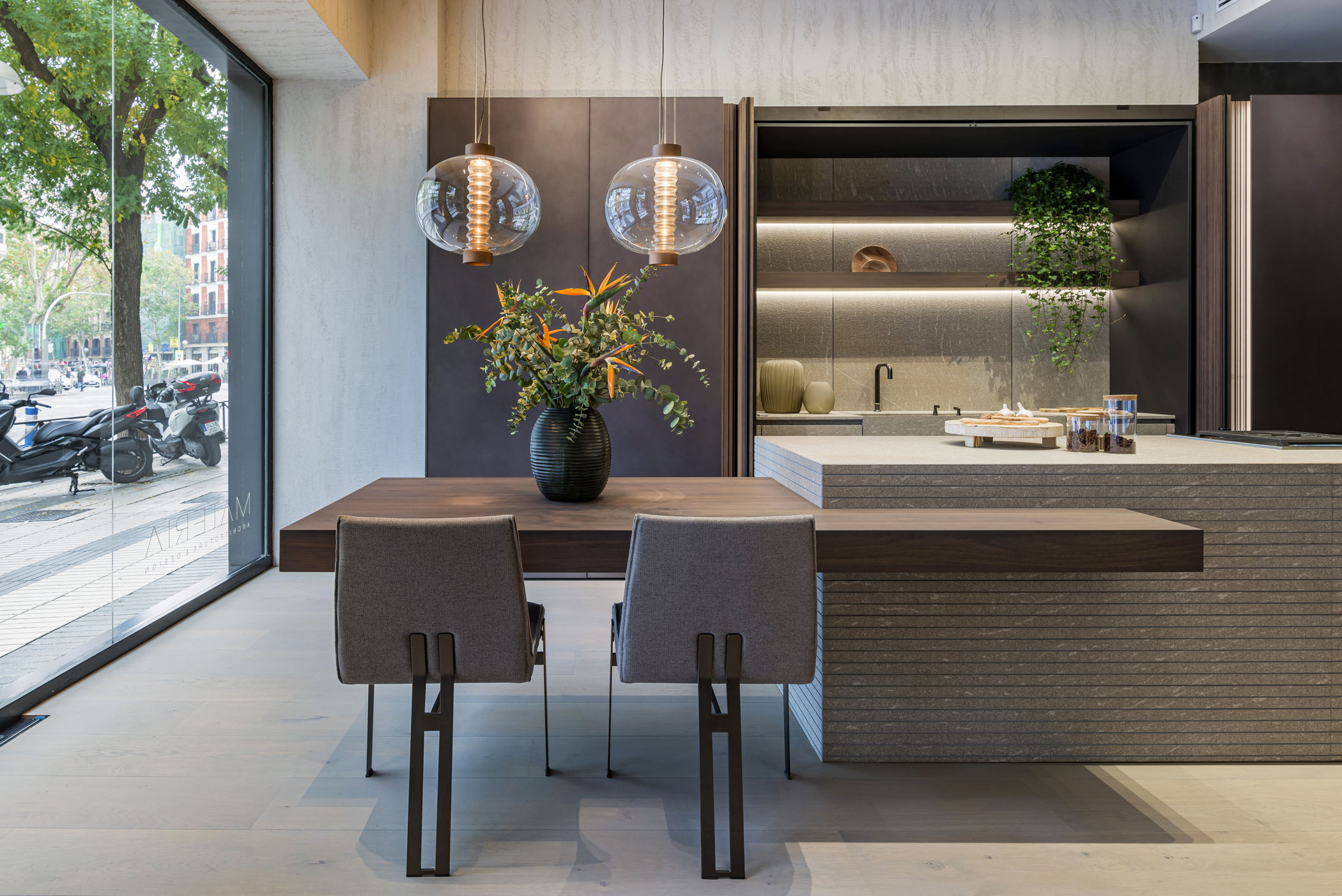 La cucina Blade Lab / Blade Edge si affaccia dalle vetrine dello store con una presenza architettonica di forte impatto, esprimendo un equilibrio calibrato tra materia, luce e proporzione. La composizione si sviluppa attorno a un’isola scultorea in Pietra Piasentina millerighe, dove la lavorazione superficiale amplifica la profondità della pietra e ne sottolinea la dimensione monolitica, mentre la penisola Snack in Noce Cenere introduce un gesto più leggero e conviviale, completando l’insieme con un segno caldo e naturale.
