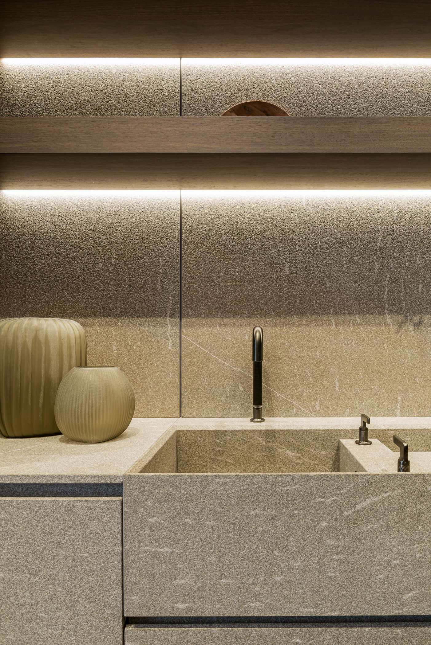 L’intero progetto è definito da un’atmosfera avvolgente e sofisticata, costruita sul dialogo tra i toni caldi del legno e la matericità autentica della pietra, che insieme generano un linguaggio coerente e continuo. Il sistema di colonne Blade Edge interpreta questo equilibrio attraverso ante che combinano l’alluminio Bronze Dust con profili in Noce Cenere, creando un raffinato gioco di profondità e riflessi, ulteriormente enfatizzato dalle ante Ghost con finitura Groove.
