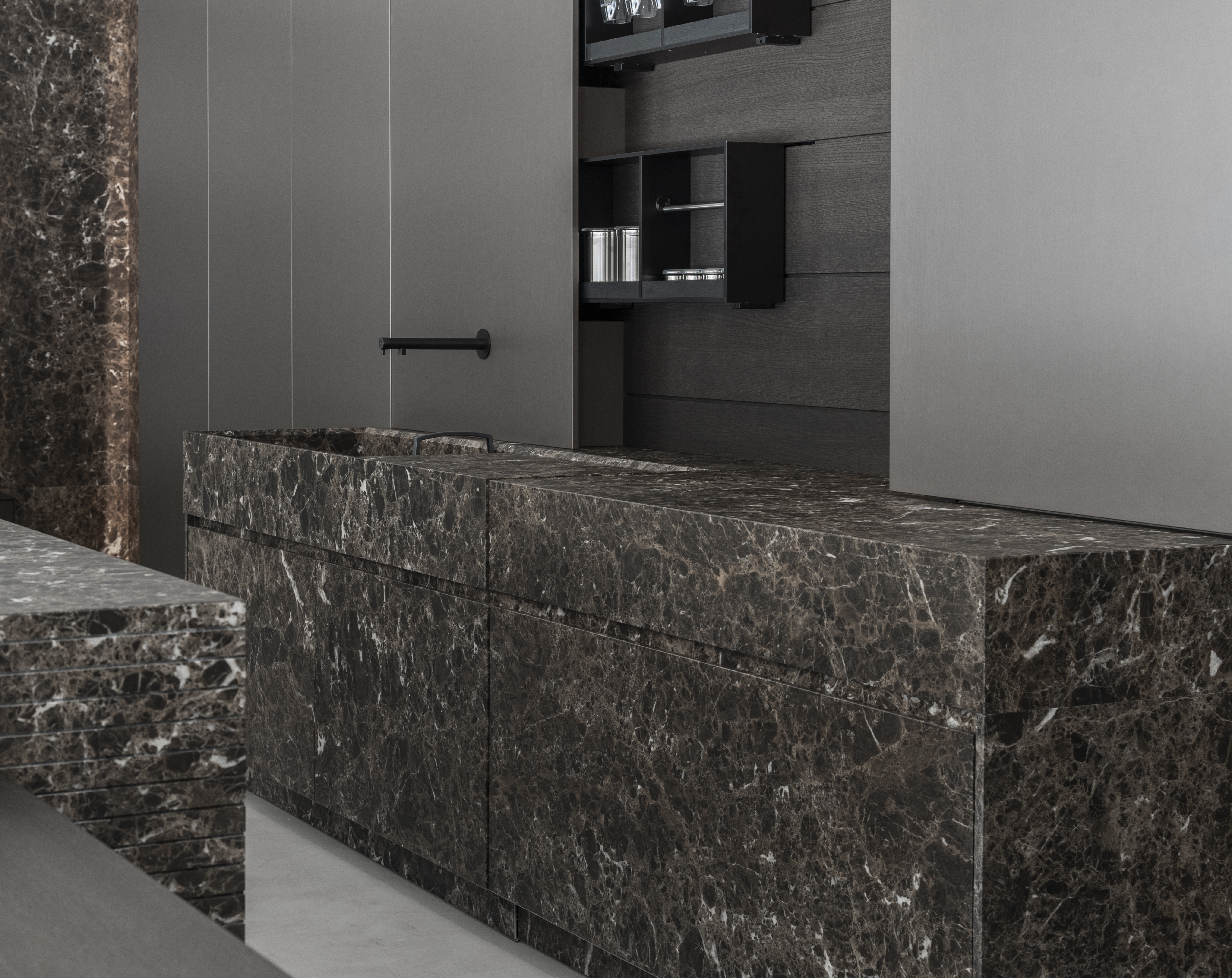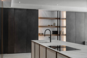 I materiali sono selezionati per le loro qualità estetiche e performative: pietre naturali dalle venature profonde, legni dalle texture autentiche e tattili, laccati opachi che restituiscono superfici continue e minimali, fino a metalli e finiture tecniche che introducono accenti contemporanei e raffinati. La lavorazione accurata esalta la matericità senza comprometterne la pulizia formale, creando un linguaggio coerente e sofisticato.