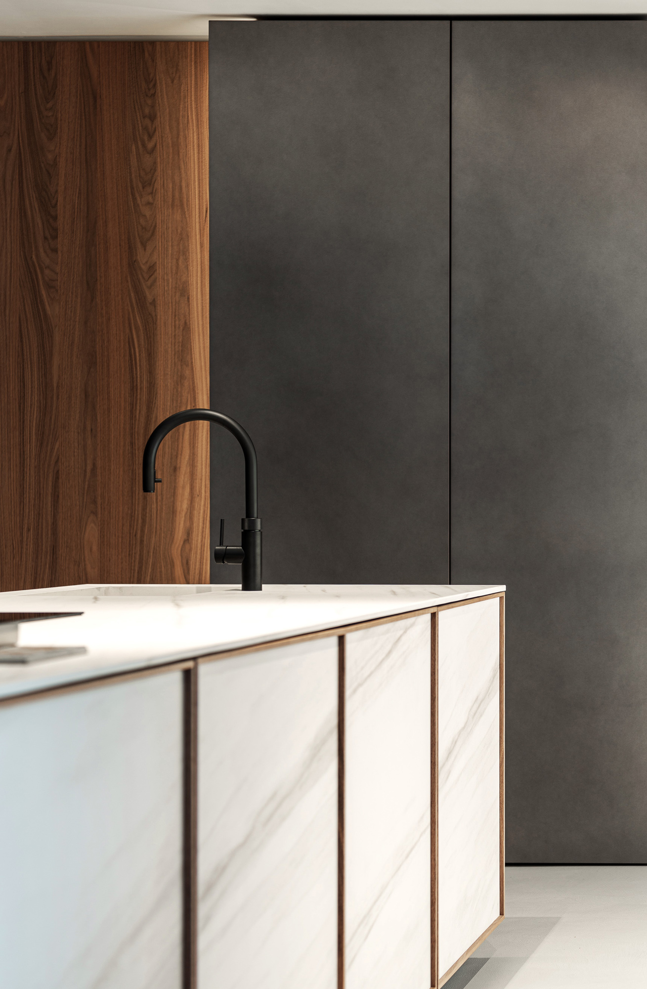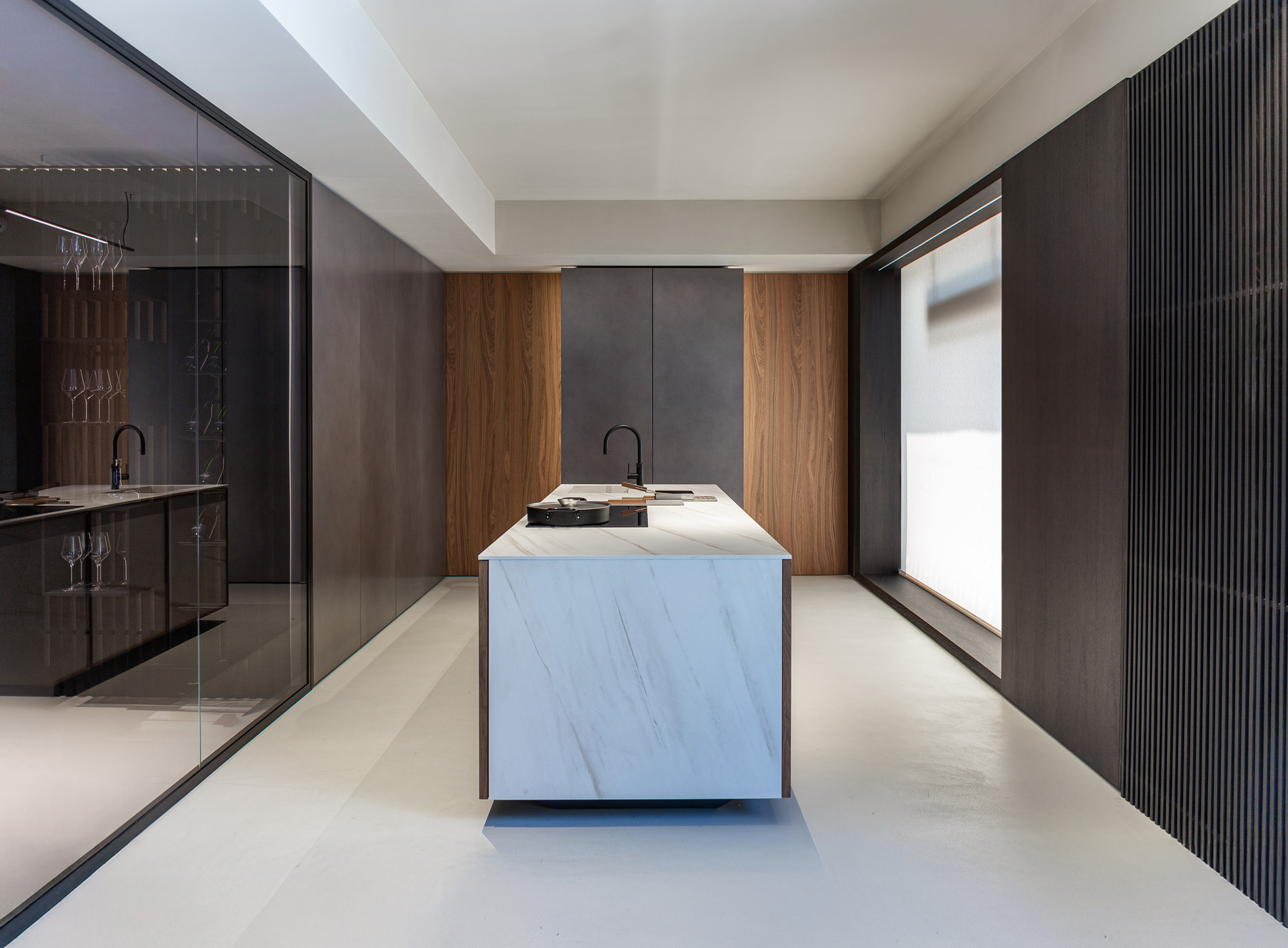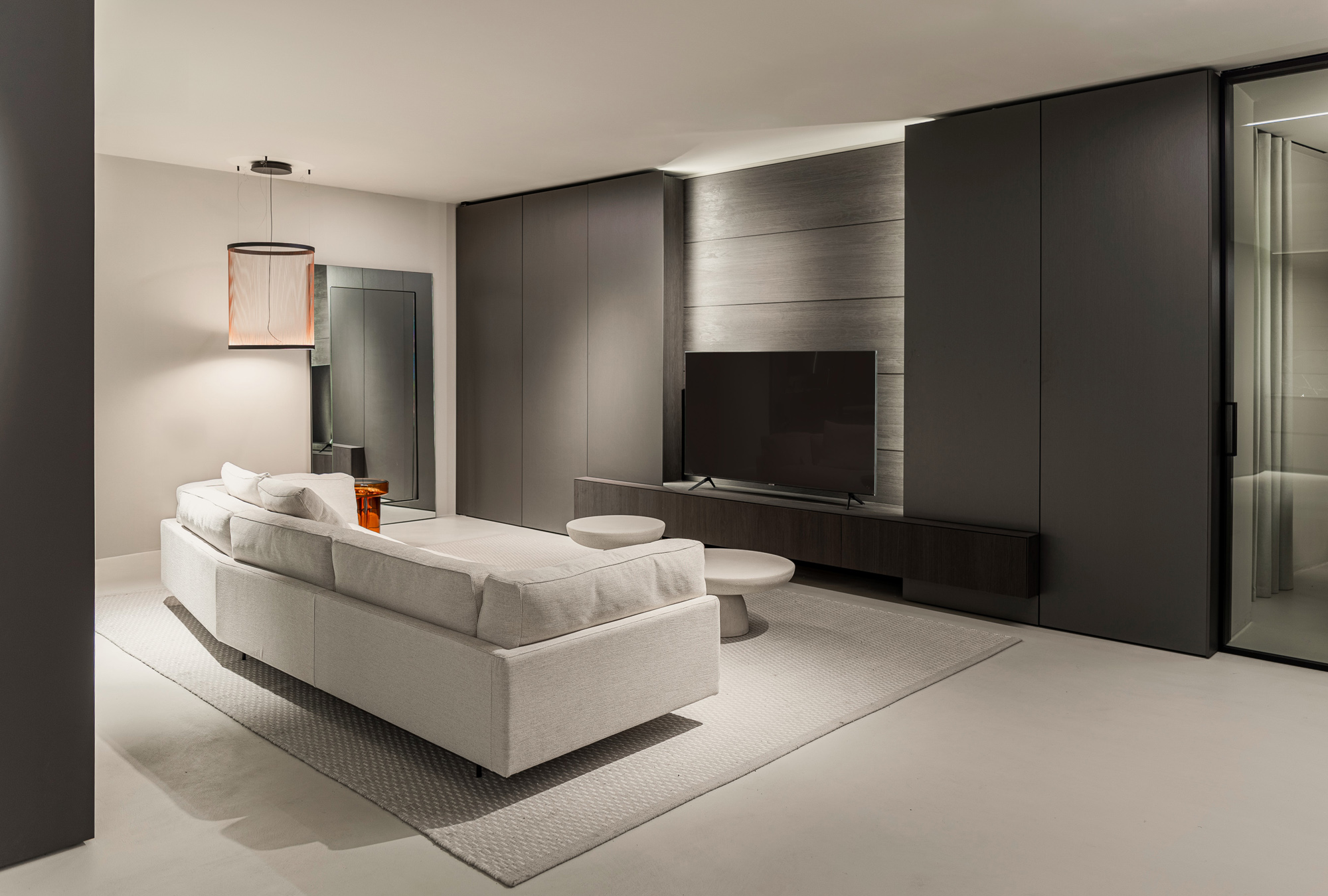 Ogni ambiente è concepito come una micro-architettura, dove cucina, living e bagno dialogano attraverso un linguaggio essenziale e rigoroso. La ricerca sui materiali — pietra, legni e superfici tecnologiche — definisce atmosfere sofisticate e avvolgenti, in cui il design si esprime attraverso equilibrio, proporzione e continuità.